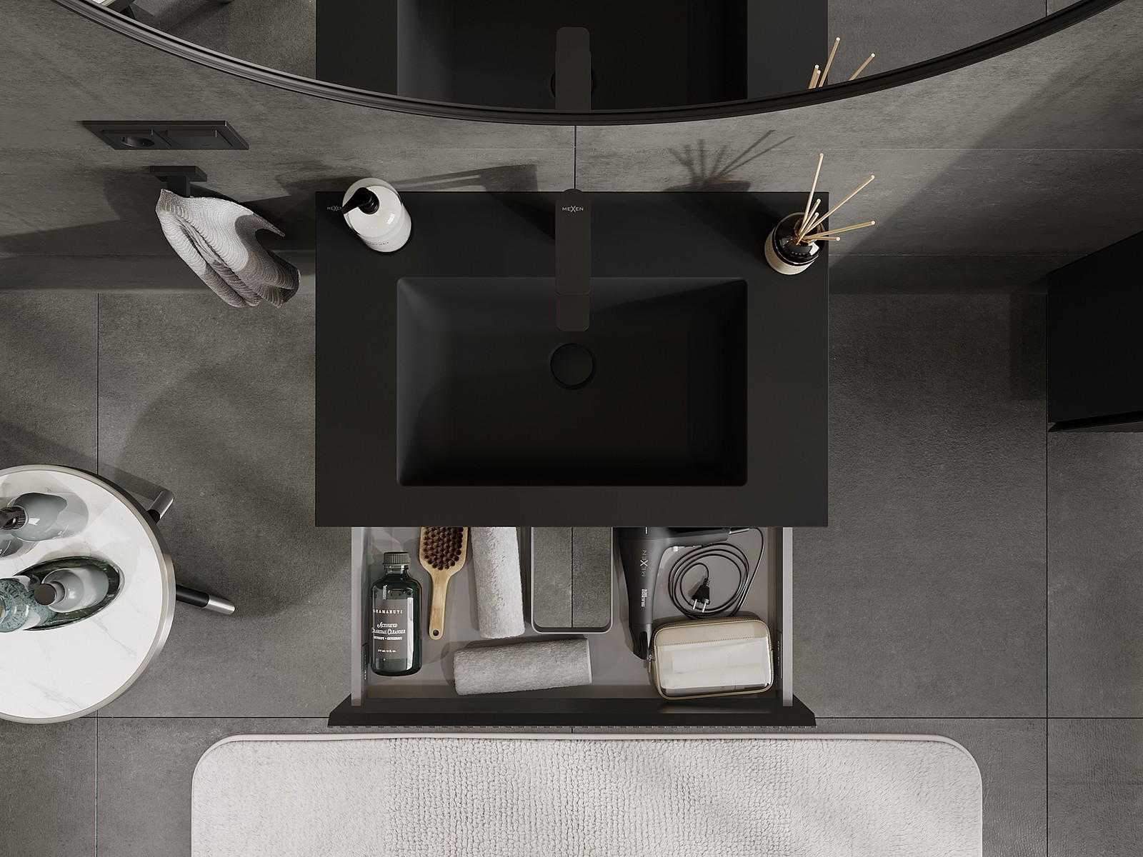 Mexen Rivel Badezimmerschrank 70 cm mit Waschbecken Otis, 1 Schublade, geriffelt, schwarz matt - 91A20-07023-1-BF71-W18M71