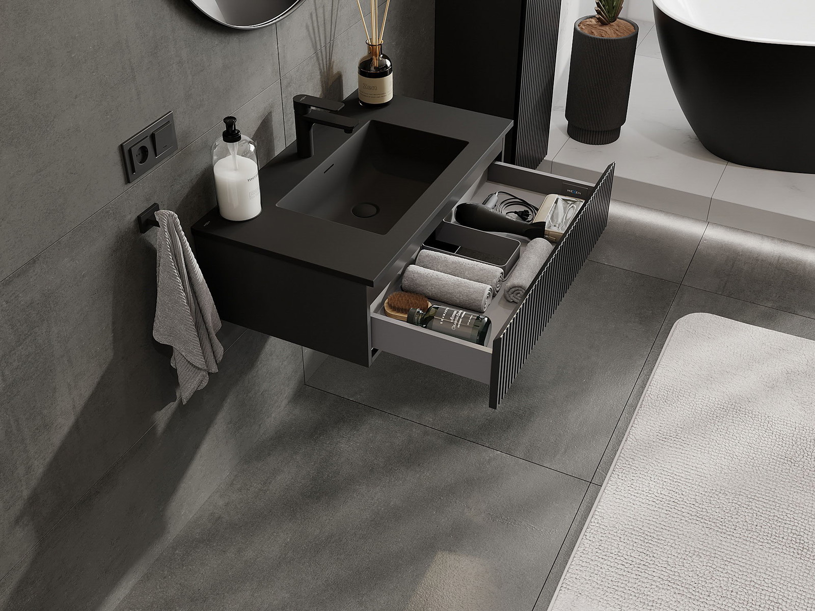 Mexen Rivel Badezimmerschrank 80 cm mit Waschbecken Otis, 1 Schublade, geriffelt, schwarzmatt - 91A20-08023-1-BF71-W18M71