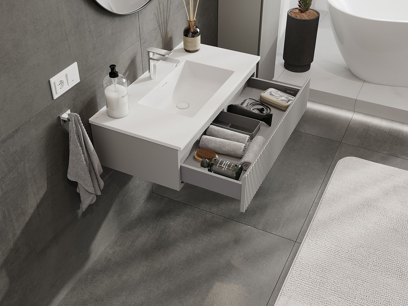Mexen Rivel Badezimmerschrank 90 cm mit Waschbecken Otis, 1 Schublade, geriffelt, grau matt/weiß matt
