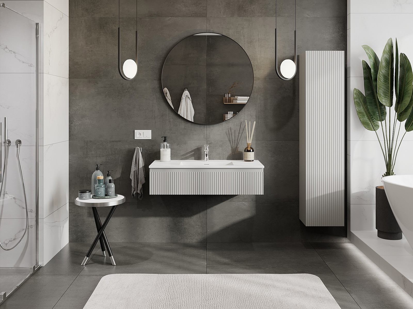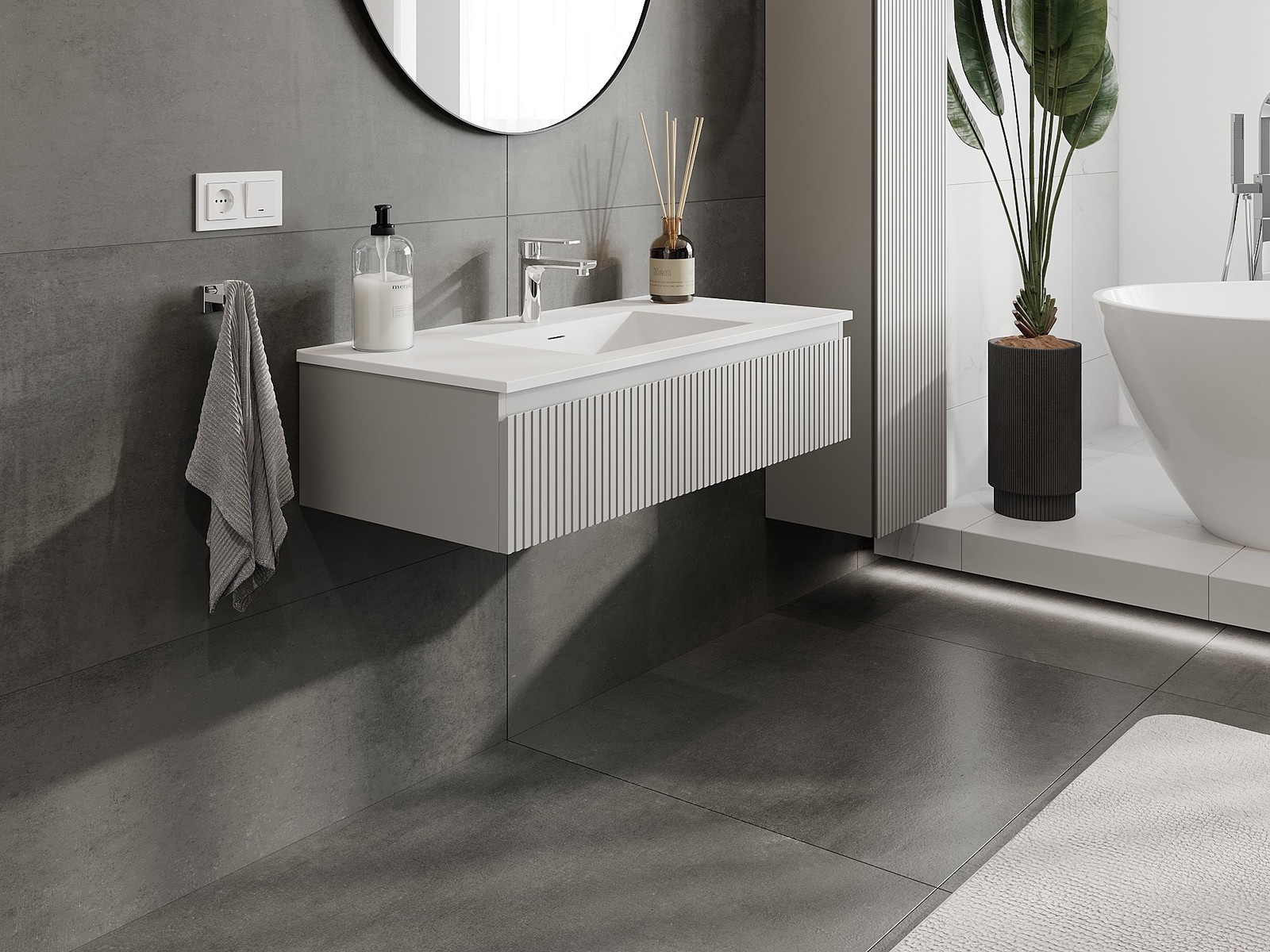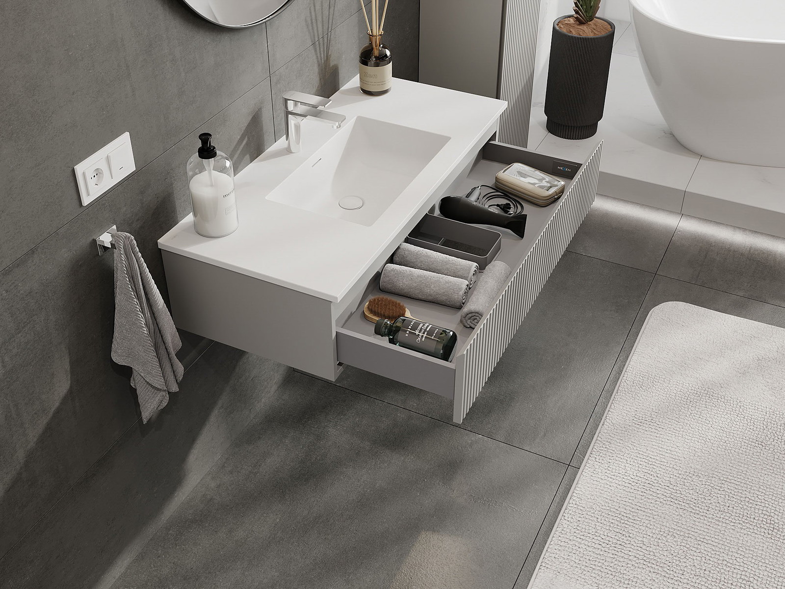 Mexen Rivel Badezimmerschrank 100 cm mit Waschbecken Otis, 1 Schublade, geriffelt, grau matt/weiß matt