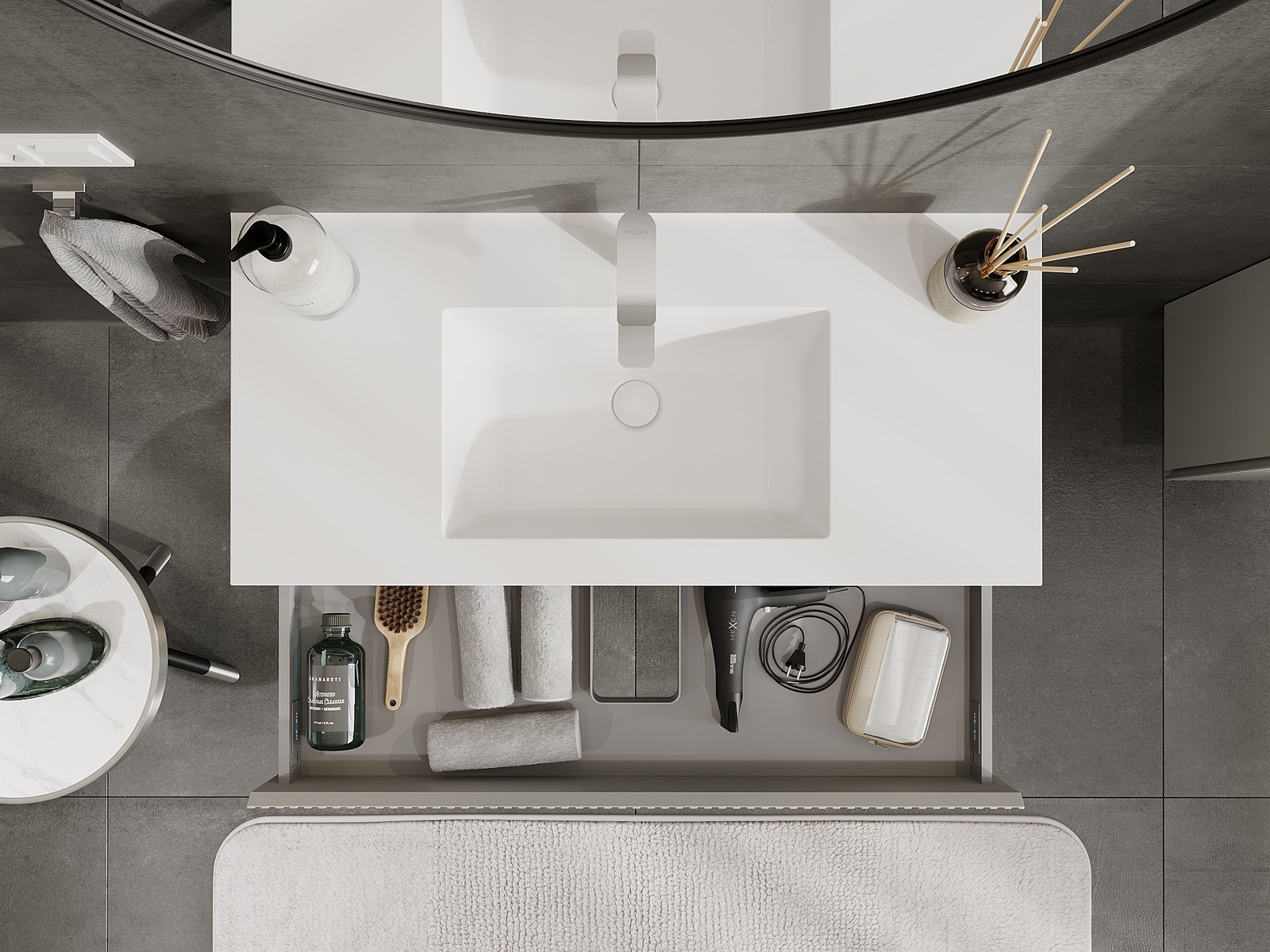 Unsere modularen Badezimmermöbel können in verschiedenen Farbkonfigurationen miteinander kombiniert werden, wodurch eine vollständige Personalisierung ermöglicht wird. Man kann sowohl das Aussehen als auch die Funktionen der einzelnen Elemente auswählen, was es erlaubt, die Möbel an eigene stilistische und funktionale Vorlieben anzupassen.