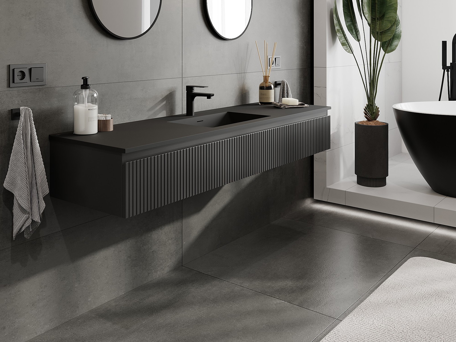 Mexen Rivel Badezimmerschrank 160 cm mit Waschbecken Otis, 1 Schublade, geriffelt, schwarz matt - 91A20-16023-1-BF71-W18M71