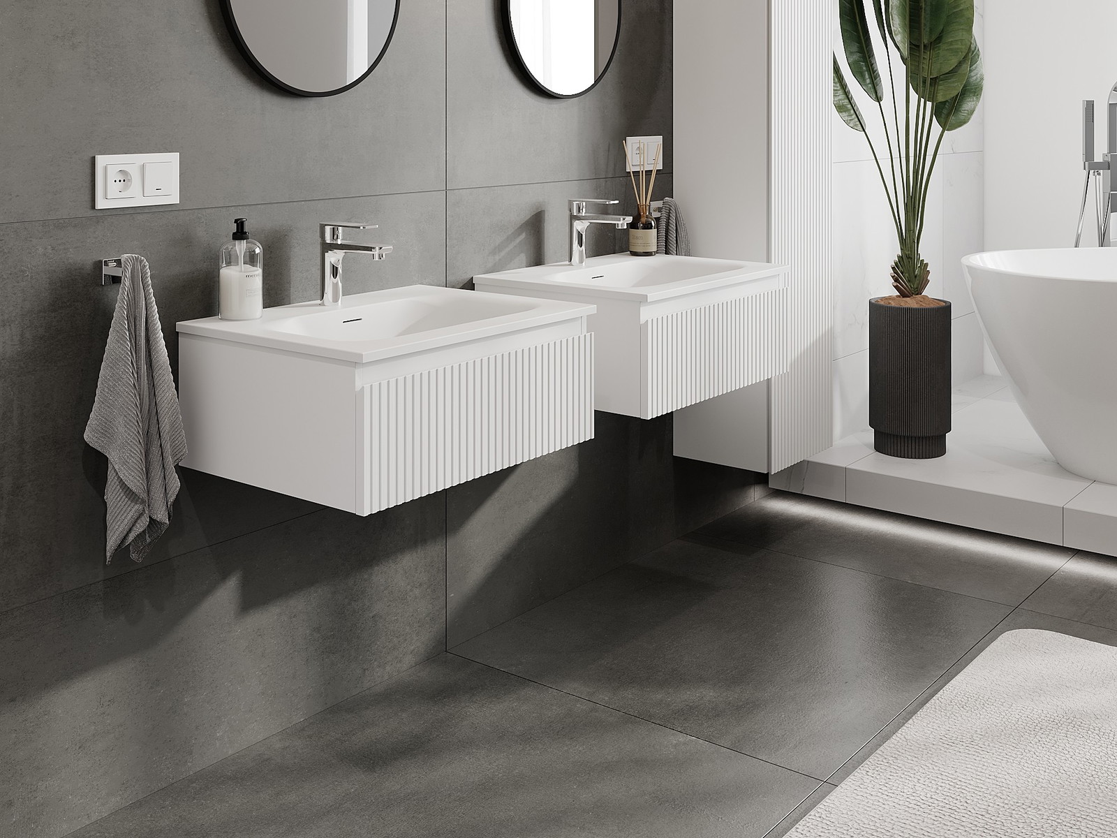 Unsere modularen Badezimmermöbel können in verschiedenen Farbkonfigurationen miteinander kombiniert werden, wodurch eine vollständige Personalisierung ermöglicht wird. Man kann sowohl das Aussehen als auch die Funktionen der einzelnen Elemente auswählen, was es erlaubt, die Möbel an eigene stilistische und funktionale Vorlieben anzupassen.