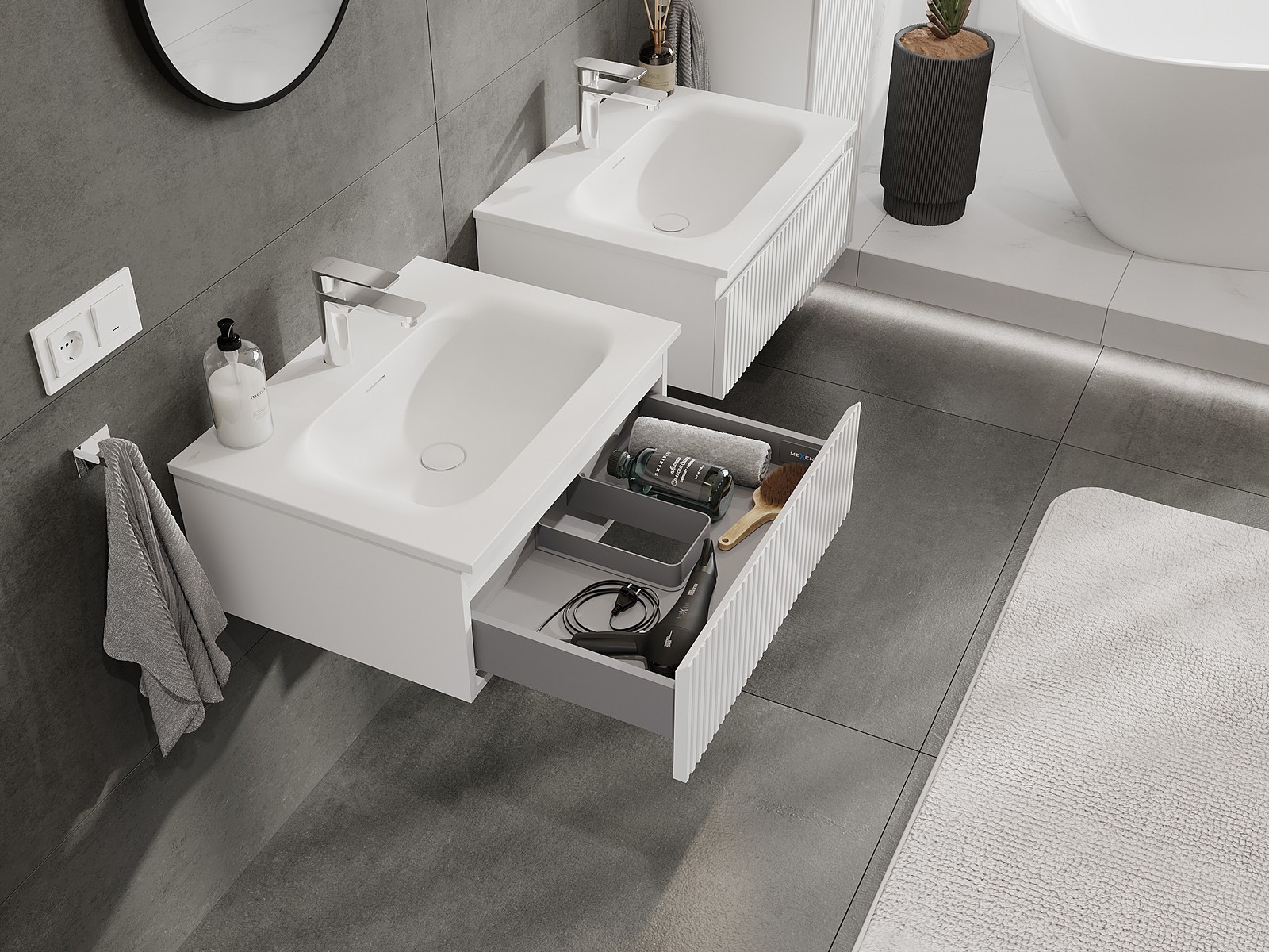 Mexen Rivel Badezimmerunterschrank 60 cm mit Waschbecken Vela, 1 Schublade, geriffelt, weiß matt - 91A20-06023-1-BF01-W23M01