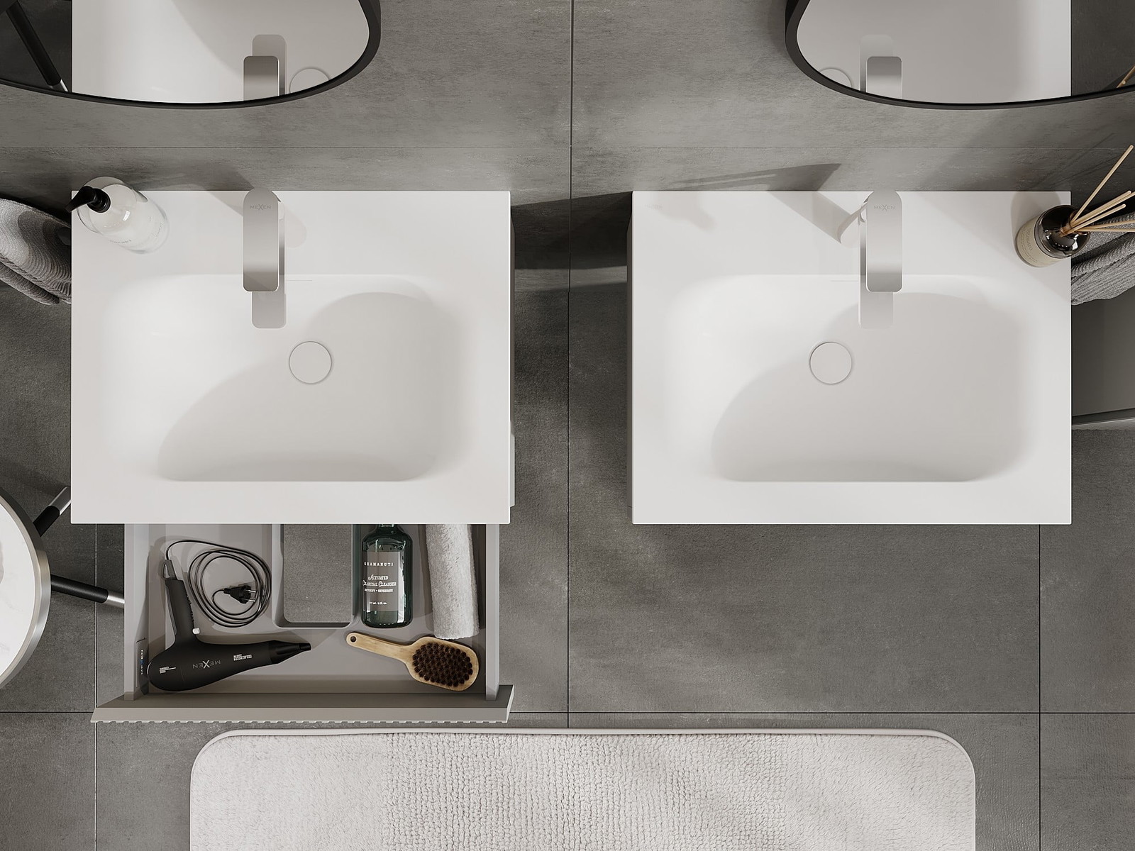 Unsere modularen Badezimmermöbel können in verschiedenen Farbkonfigurationen miteinander kombiniert werden, wodurch eine vollständige Personalisierung ermöglicht wird. Man kann sowohl das Aussehen als auch die Funktionen der einzelnen Elemente auswählen, was es erlaubt, die Möbel an eigene stilistische und funktionale Vorlieben anzupassen.