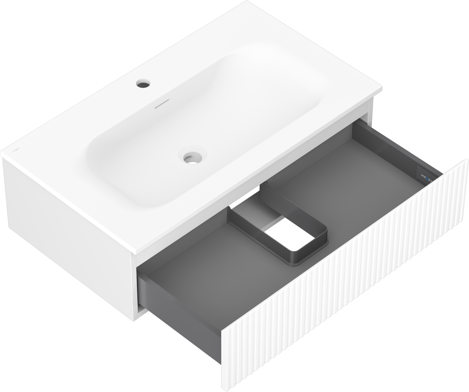 Der Ausschnitt in der Schublade ist so gestaltet, dass er den Siphon aufnehmen kann, der für Waschbeckeninstallationen erforderlich ist. Dadurch kann das Möbelstück voll funktionsfähig montiert werden, ohne auf den Platz in der Schublade zugunsten der Installation verzichten zu müssen.