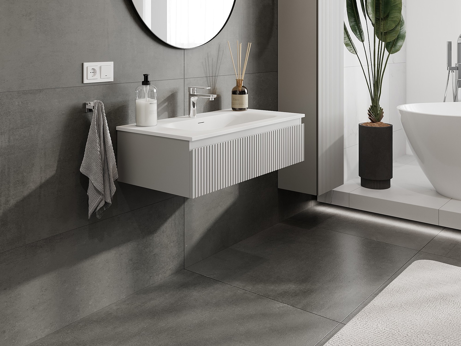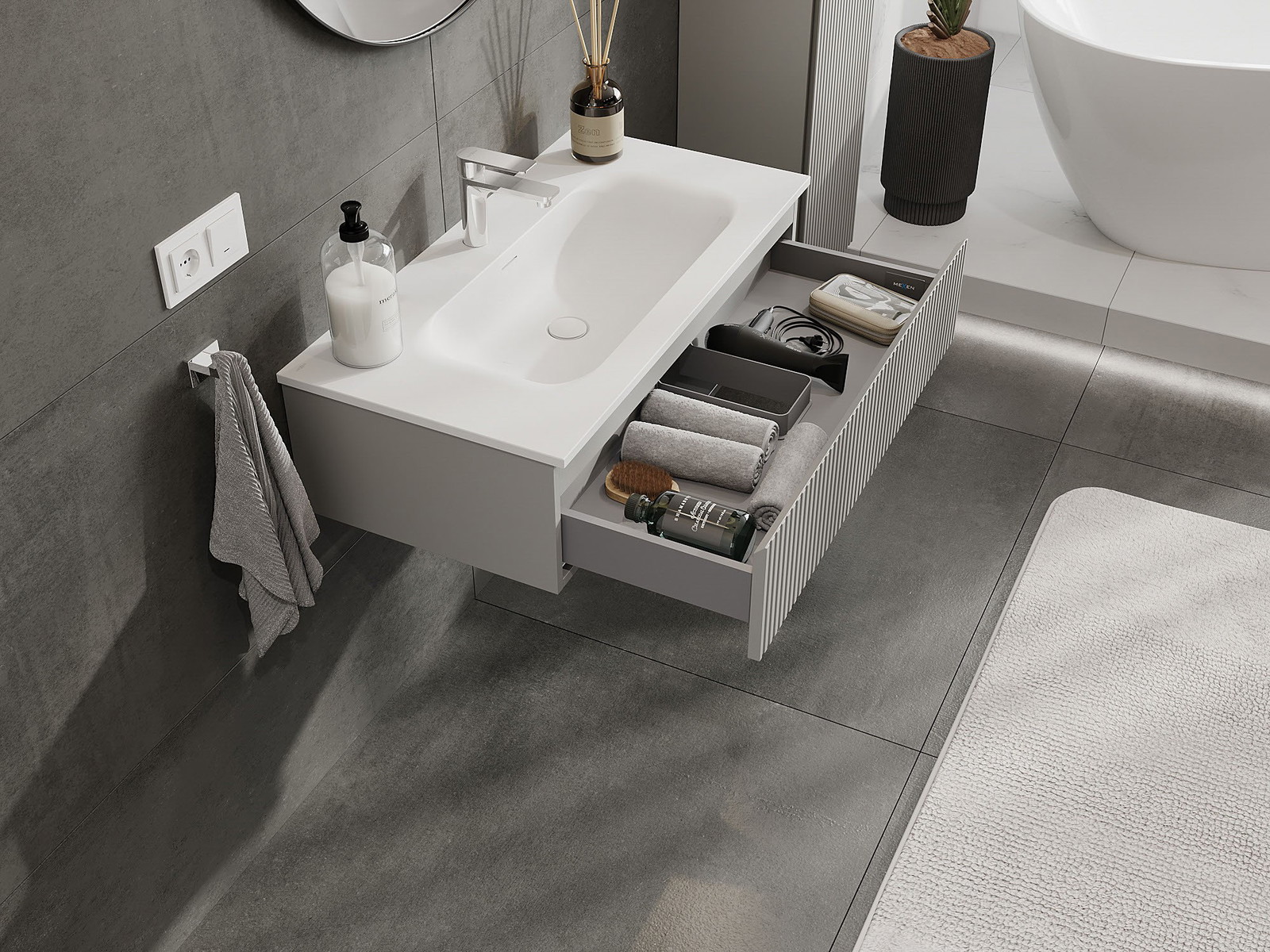 Mexen Rivel Badezimmermöbel 90 cm mit Waschbecken Vela, 1 Schublade, geriffelt, grau matt/weiß matt - 91A20-09023-1-BF62-W23M01