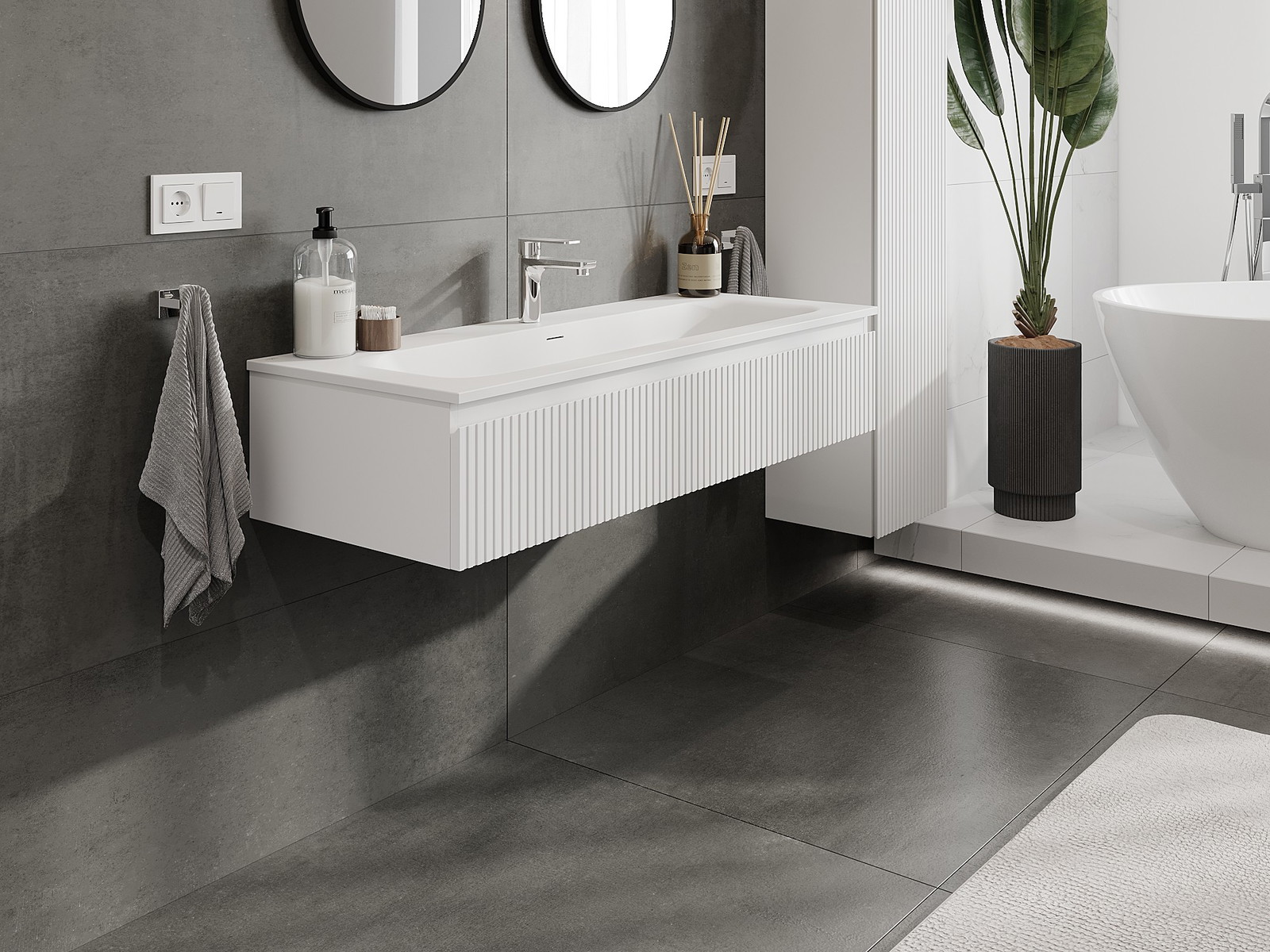 Mexen Rivel Badezimmerschrank 120 cm mit Waschbecken Vela, 1 Schublade, geriffelt, weiß matt - 91A20-12023-1-BF01-W23M01