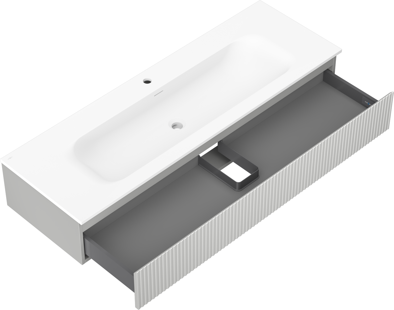 Der Ausschnitt in der Schublade ist so gestaltet, dass er den Siphon aufnehmen kann, der für Waschbeckeninstallationen erforderlich ist. Dadurch kann das Möbelstück voll funktionsfähig montiert werden, ohne auf den Platz in der Schublade zugunsten der Installation verzichten zu müssen.