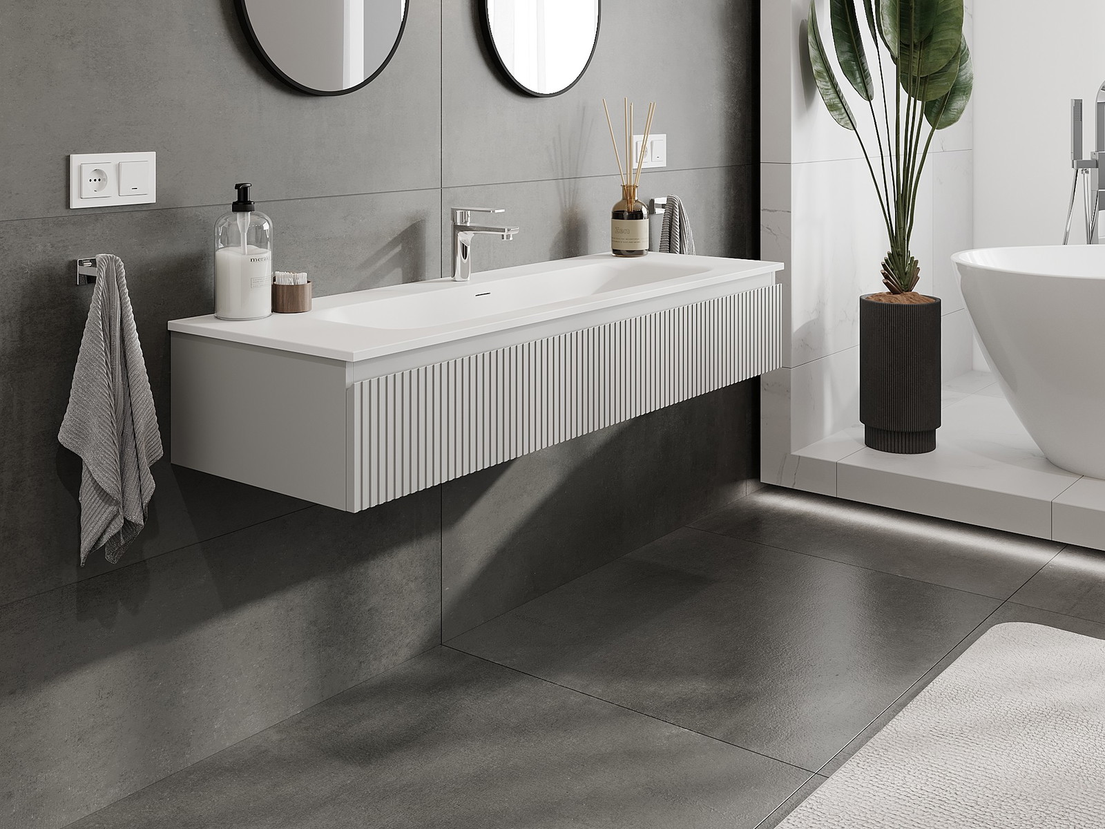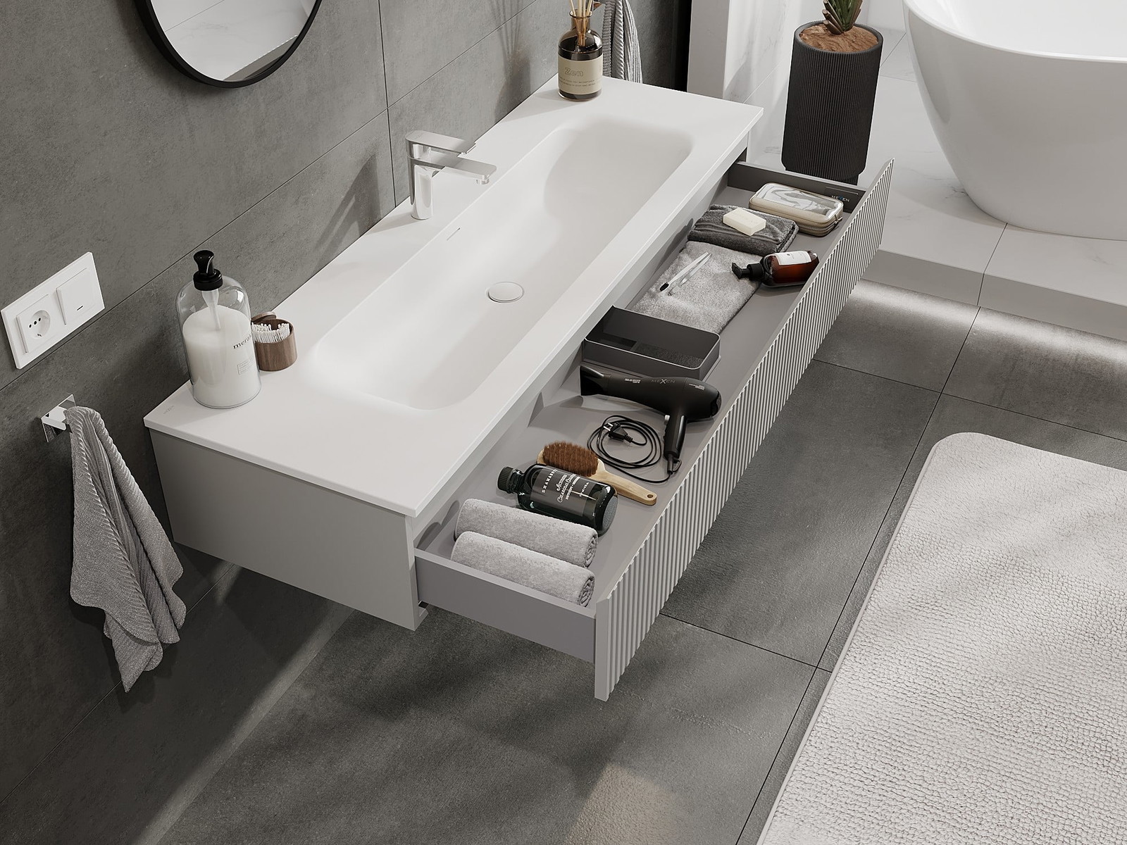 Unsere modularen Badezimmermöbel können in verschiedenen Farbkonfigurationen miteinander kombiniert werden, wodurch eine vollständige Personalisierung ermöglicht wird. Man kann sowohl das Aussehen als auch die Funktionen der einzelnen Elemente auswählen, was es erlaubt, die Möbel an eigene stilistische und funktionale Vorlieben anzupassen.