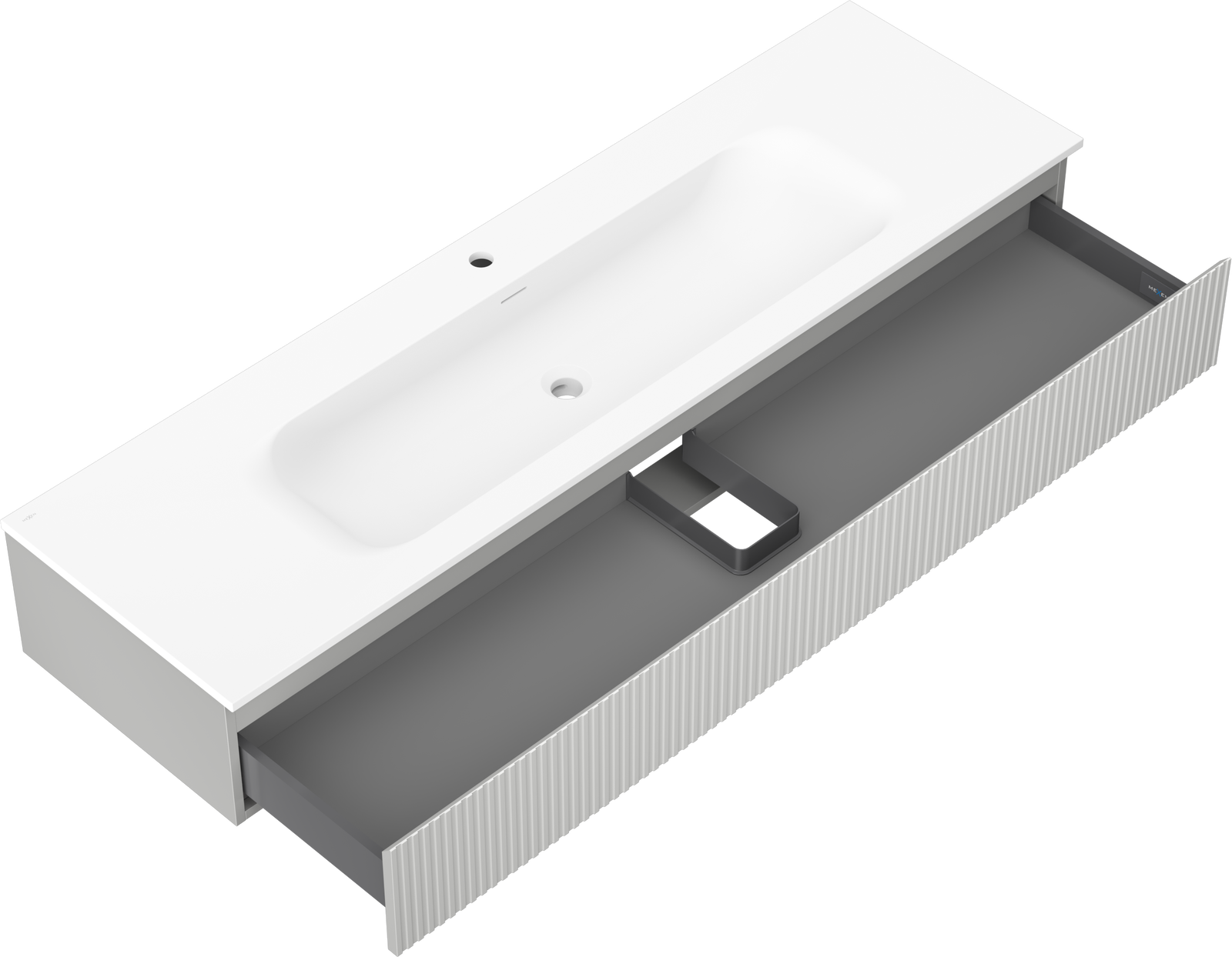 Der Ausschnitt in der Schublade ist so gestaltet, dass er den Siphon aufnehmen kann, der für Waschbeckeninstallationen erforderlich ist. Dadurch kann das Möbelstück voll funktionsfähig montiert werden, ohne auf den Platz in der Schublade zugunsten der Installation verzichten zu müssen.