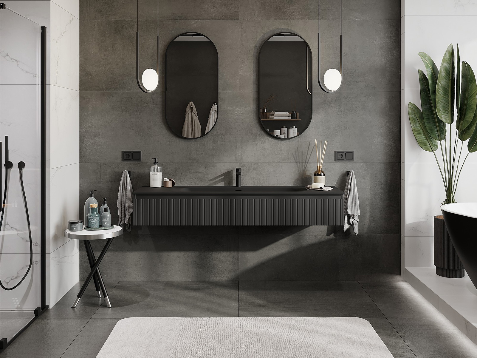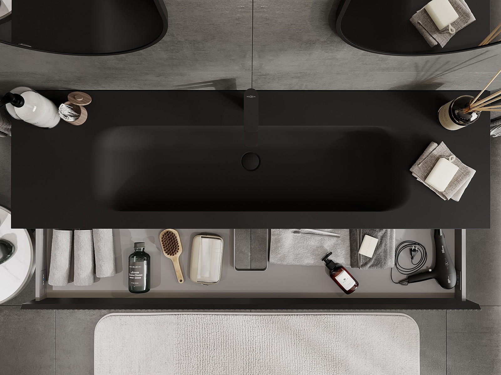 Mexen Rivel Badezimmermöbel 160 cm mit Vela-Waschbecken, 1 Schublade, gerillt, schwarz matt - 91A20-16023-1-BF71-W23M71