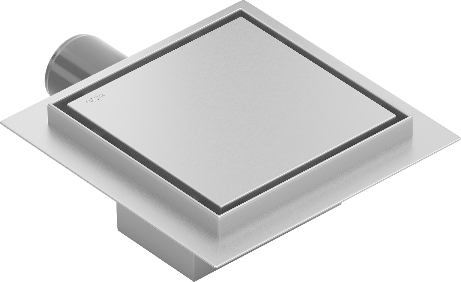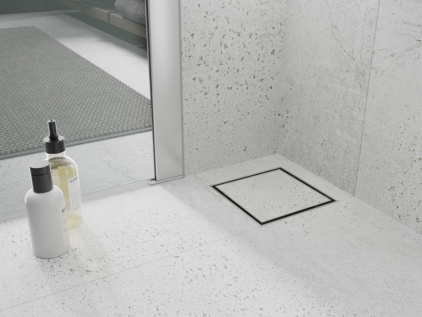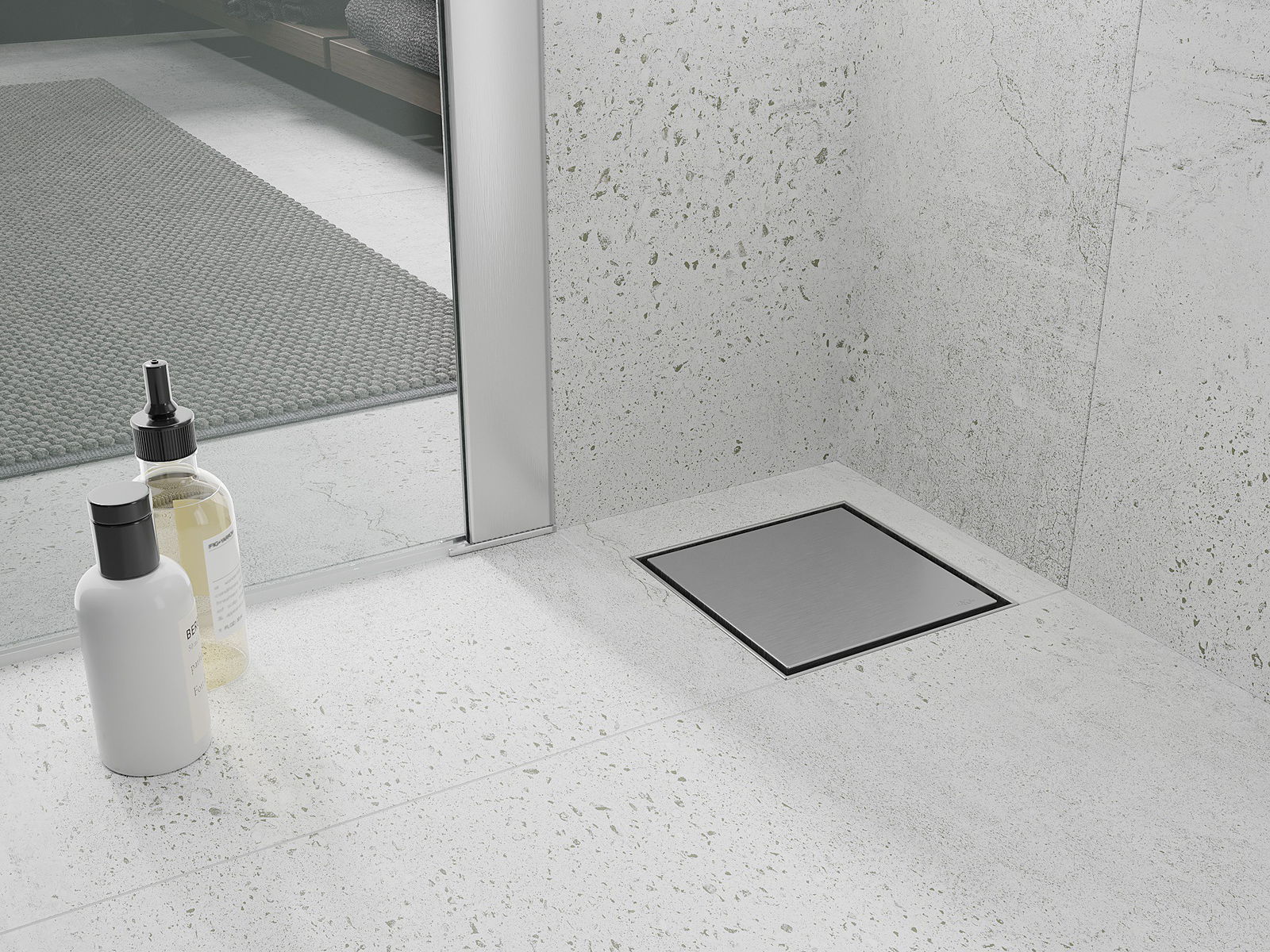 Die beidseitige Abdeckung mit der Möglichkeit, sie jederzeit zu drehen, ermöglicht eine Änderung der Anordnung. Auf einer Seite befindet sich glatter Edelstahl, beim Umdrehen kann die Abdeckung mit Fliesen verkleidet werden, um eine Verbindung mit dem Boden herzustellen.
