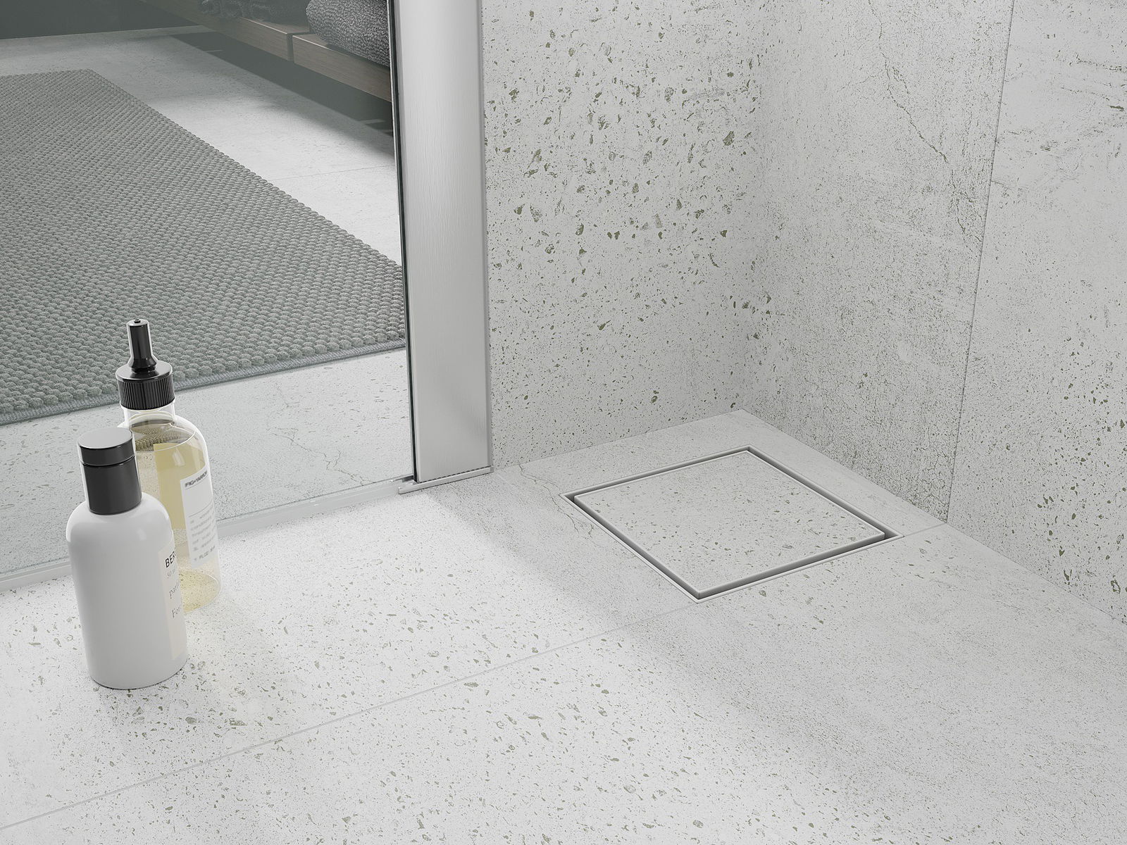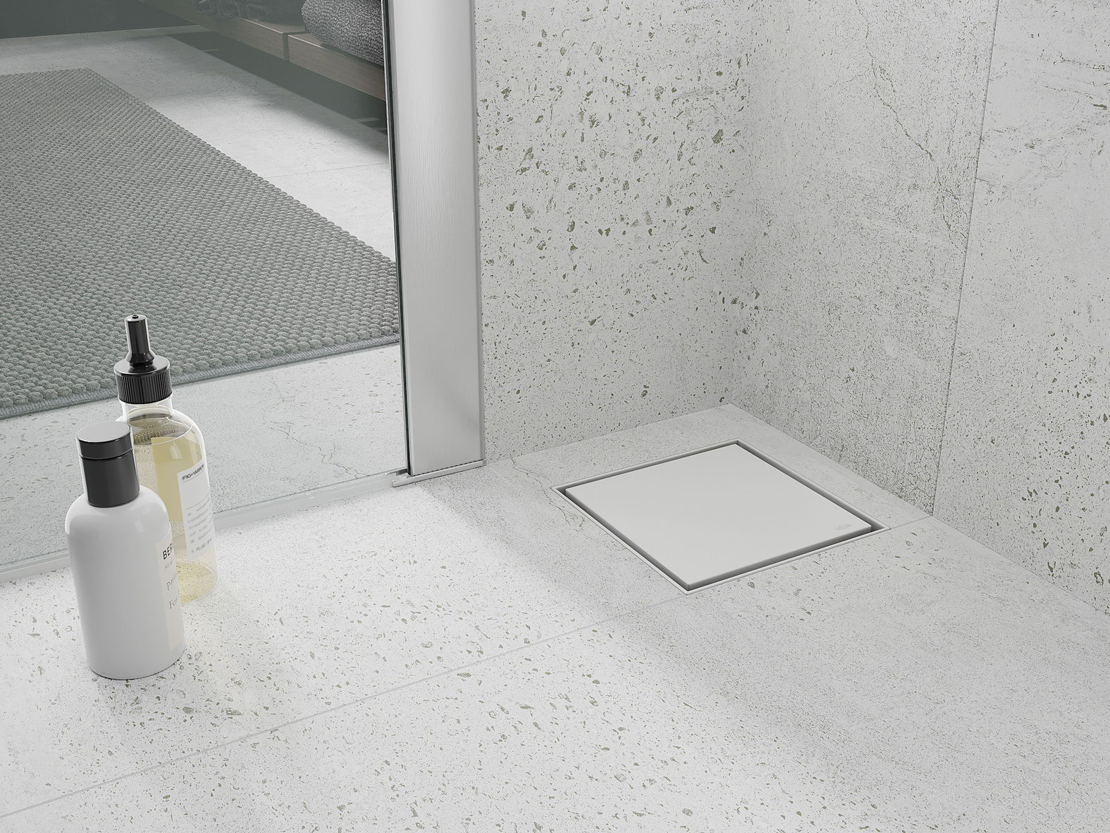Die beidseitige Abdeckung mit der Möglichkeit, sie jederzeit zu drehen, ermöglicht eine Änderung der Anordnung. Auf einer Seite befindet sich glatter Edelstahl, beim Umdrehen kann die Abdeckung mit Fliesen verkleidet werden, um eine Verbindung mit dem Boden herzustellen.