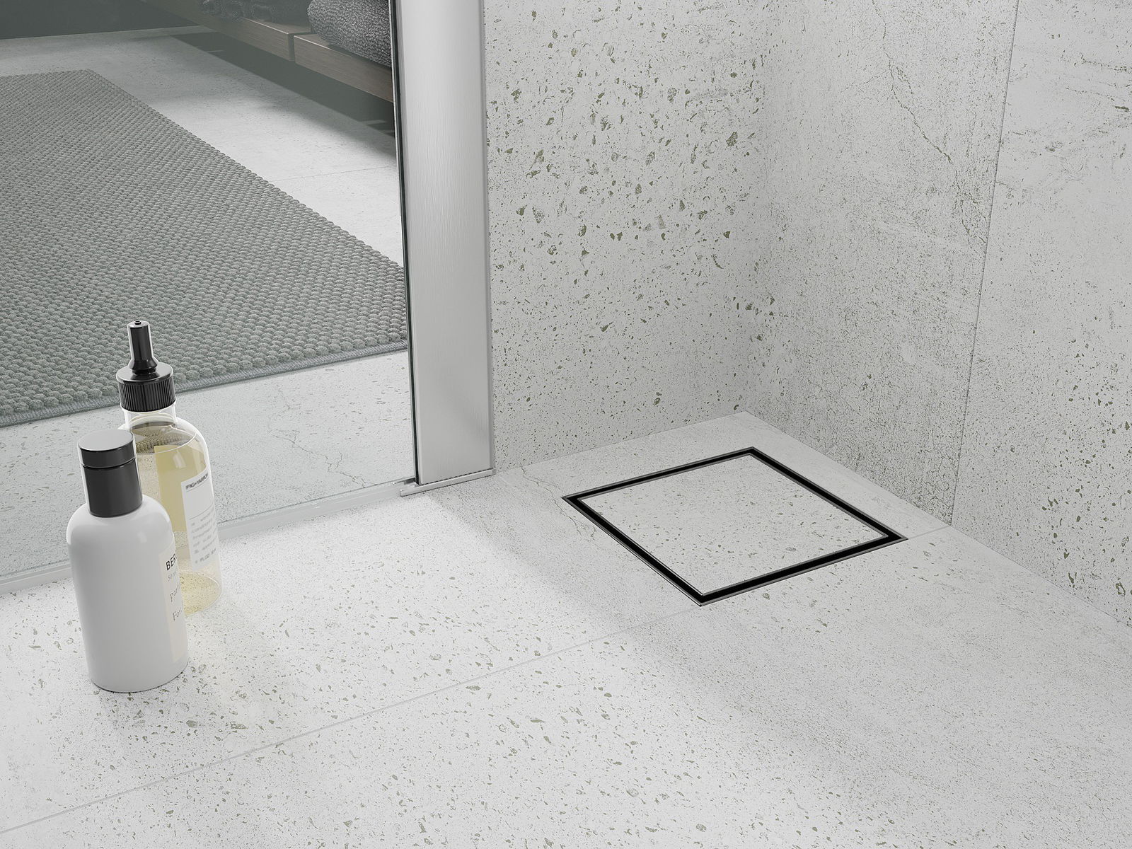 Die beidseitige Abdeckung mit der Möglichkeit, sie jederzeit zu drehen, ermöglicht eine Änderung der Anordnung. Auf einer Seite befindet sich glatter Edelstahl, beim Umdrehen kann die Abdeckung mit Fliesen verkleidet werden, um eine Verbindung mit dem Boden herzustellen.