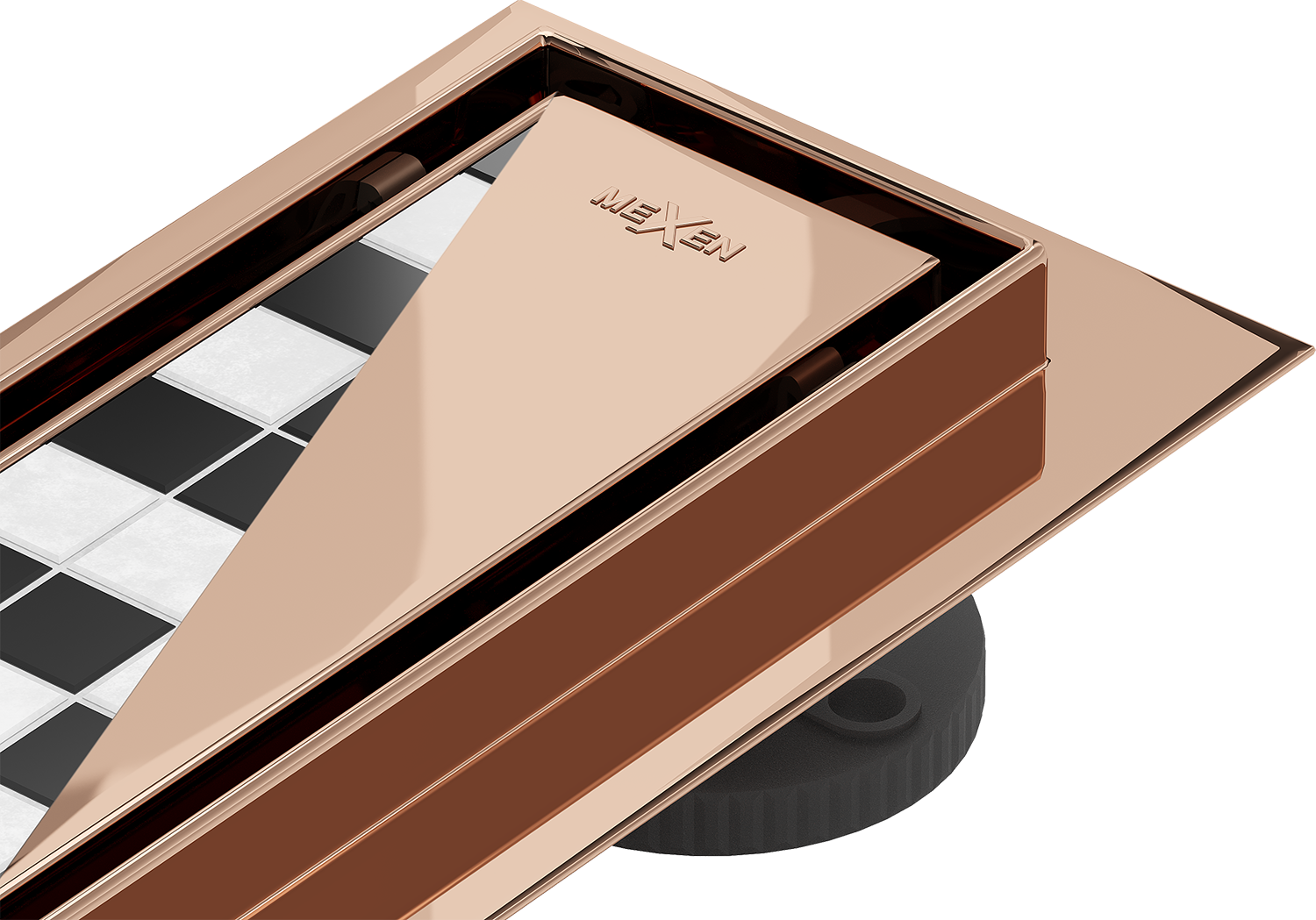 Die beidseitige Abdeckung mit der Möglichkeit, sie jederzeit zu drehen, ermöglicht eine Änderung der Anordnung. Auf einer Seite befindet sich glatter Edelstahl, beim Umdrehen kann die Abdeckung mit Fliesen verkleidet werden, um eine Verbindung mit dem Boden herzustellen.