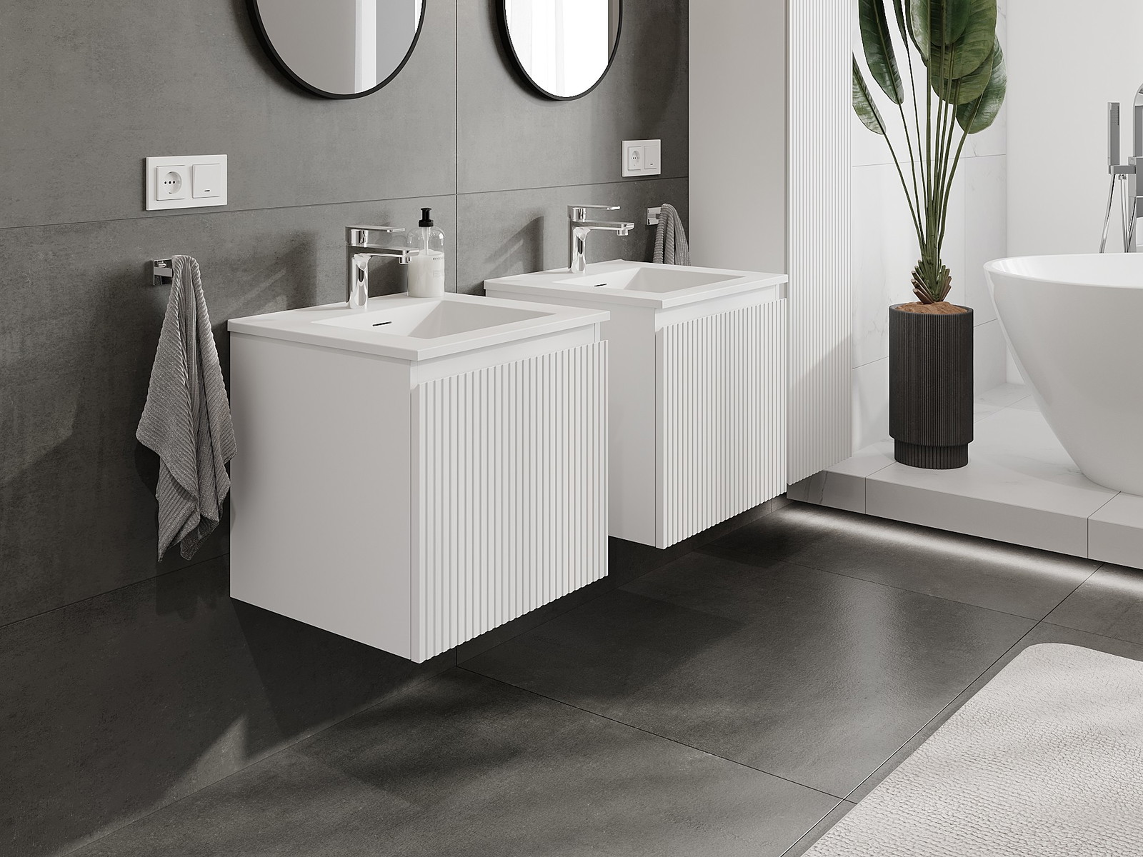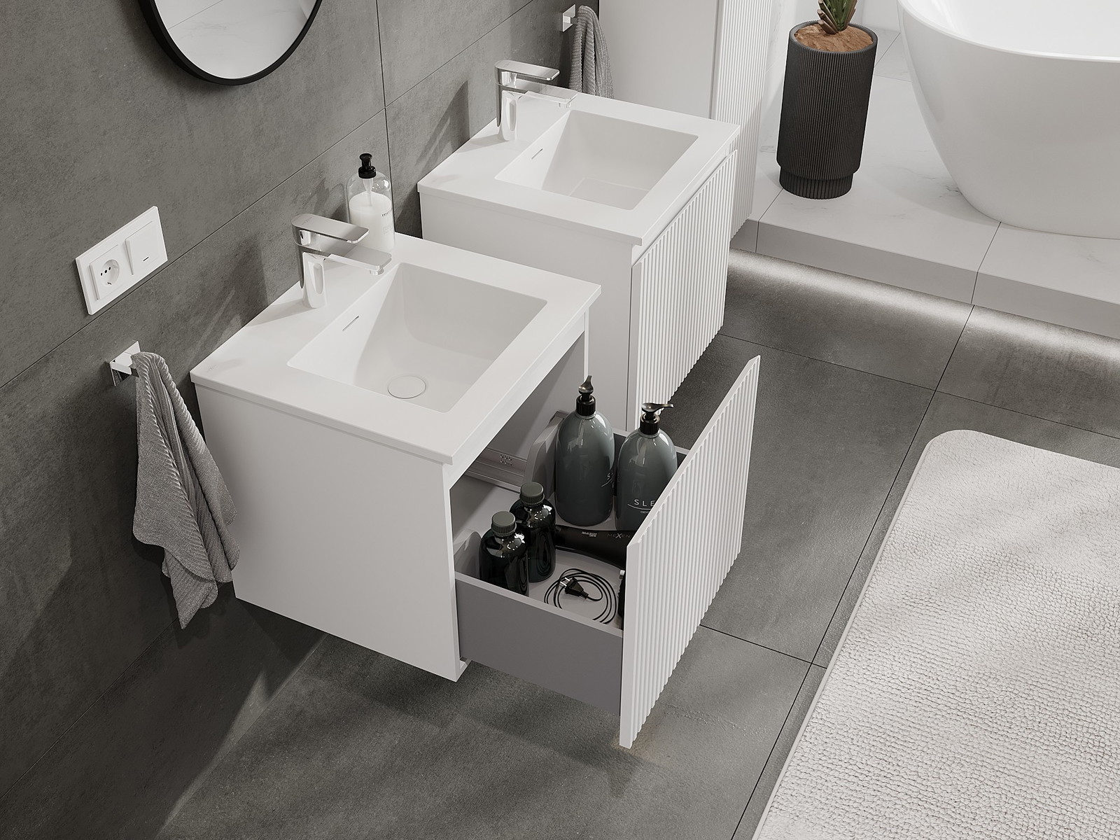 Unsere modularen Badezimmermöbel können in verschiedenen Farbkonfigurationen miteinander kombiniert werden, wodurch eine vollständige Personalisierung ermöglicht wird. Man kann sowohl das Aussehen als auch die Funktionen der einzelnen Elemente auswählen, was es erlaubt, die Möbel an eigene stilistische und funktionale Vorlieben anzupassen.