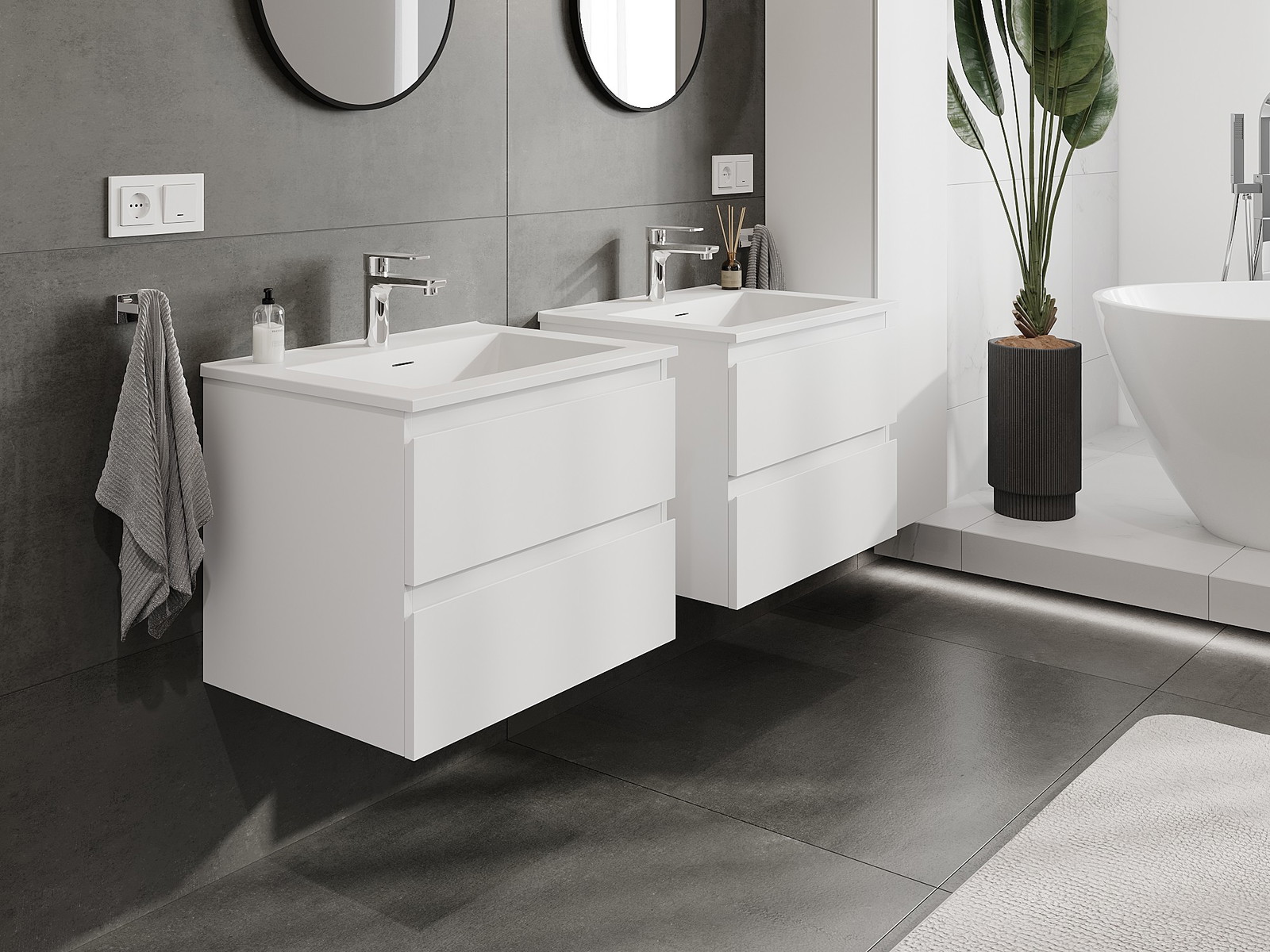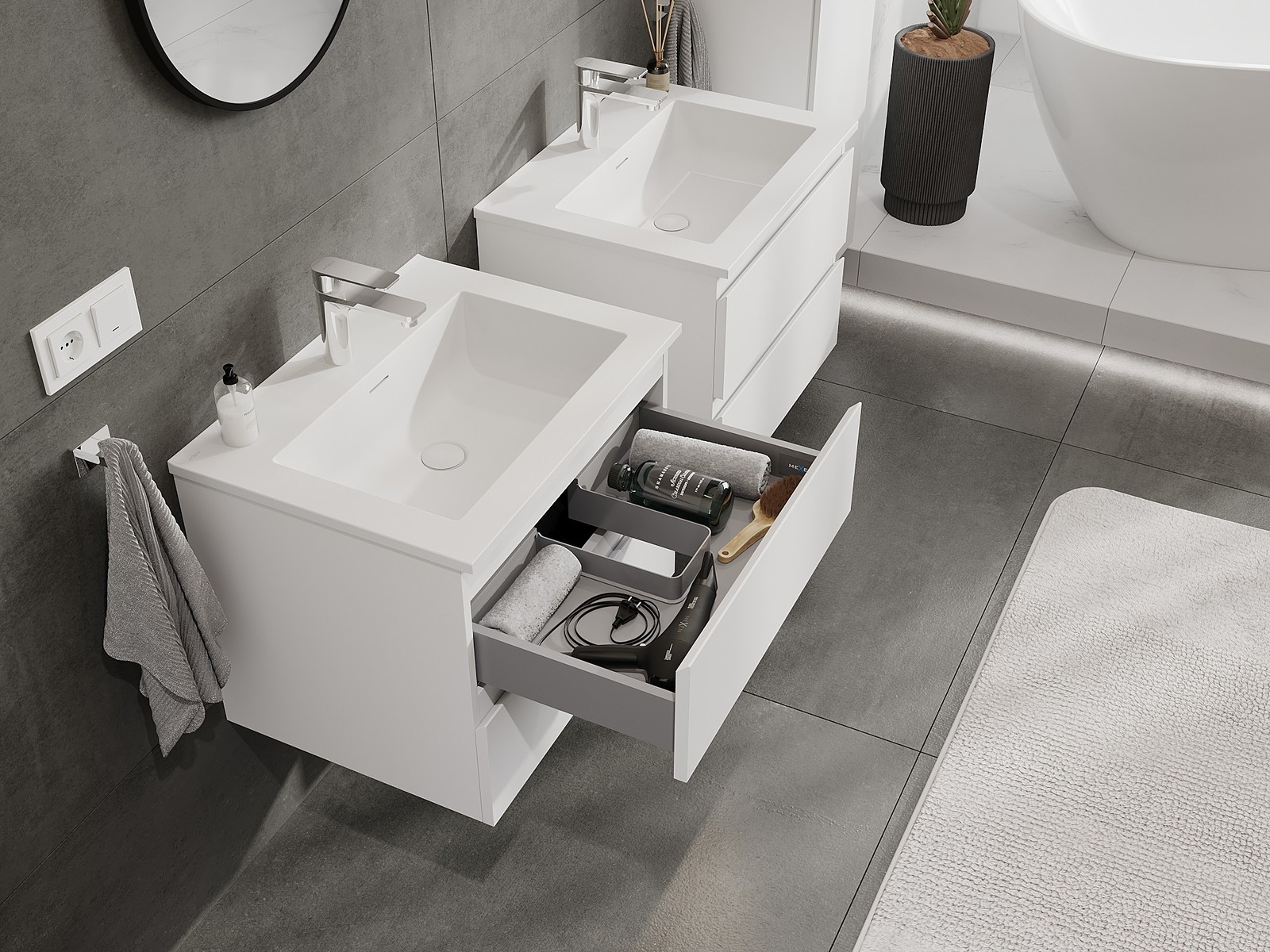 Unsere modularen Badezimmermöbel können in verschiedenen Farbkonfigurationen miteinander kombiniert werden, wodurch eine vollständige Personalisierung ermöglicht wird. Man kann sowohl das Aussehen als auch die Funktionen der einzelnen Elemente auswählen, was es erlaubt, die Möbel an eigene stilistische und funktionale Vorlieben anzupassen.