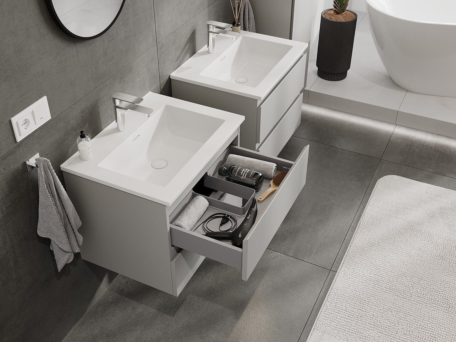 Unsere modularen Badezimmermöbel können in verschiedenen Farbkonfigurationen miteinander kombiniert werden, wodurch eine vollständige Personalisierung ermöglicht wird. Man kann sowohl das Aussehen als auch die Funktionen der einzelnen Elemente auswählen, was es erlaubt, die Möbel an eigene stilistische und funktionale Vorlieben anzupassen.