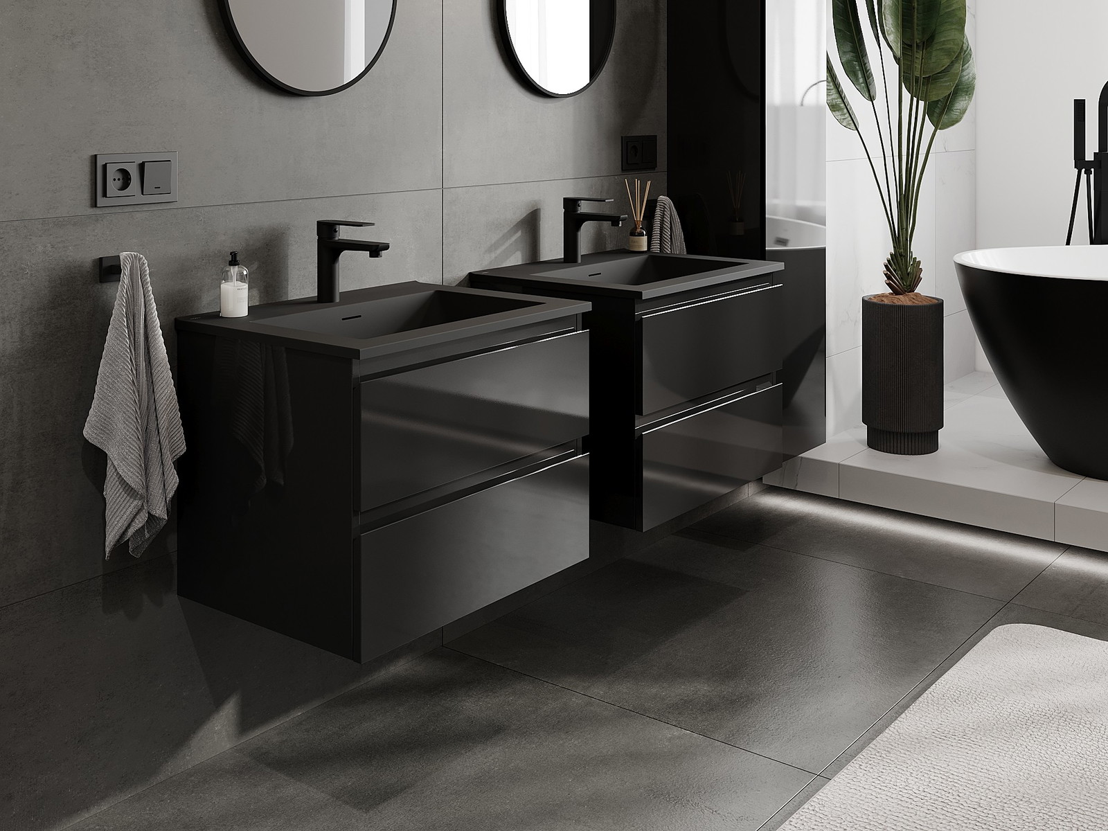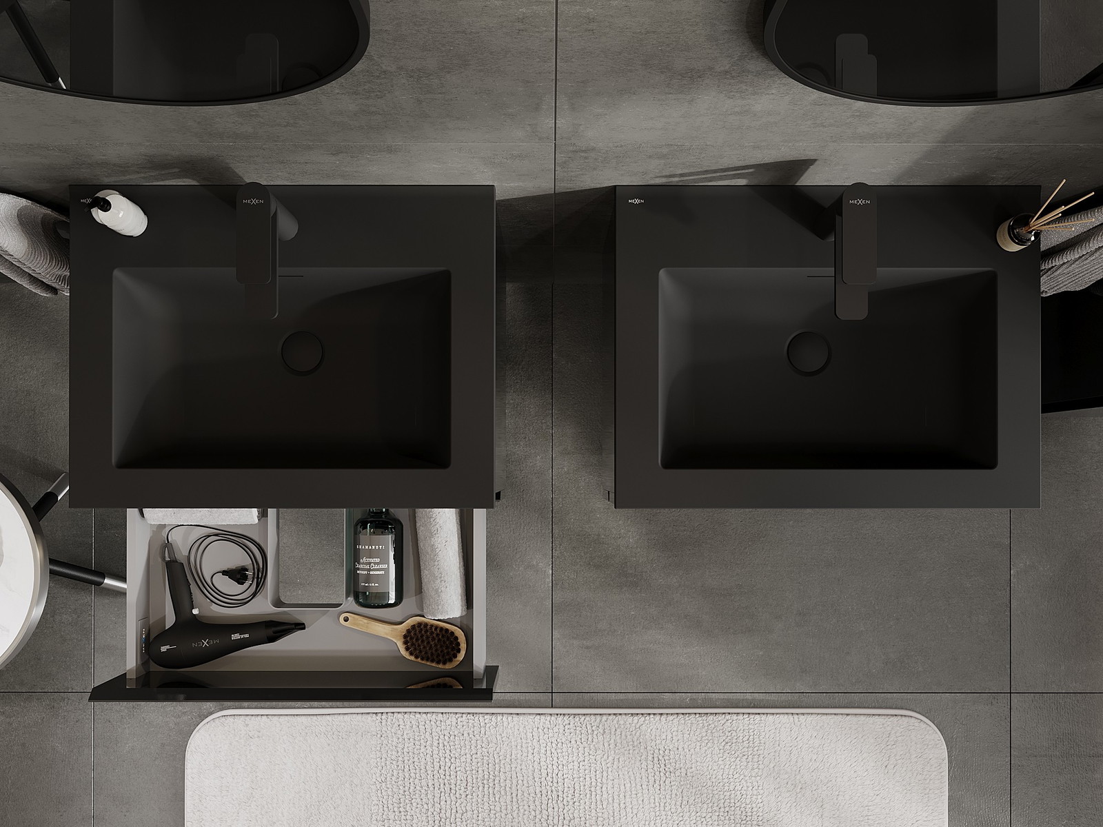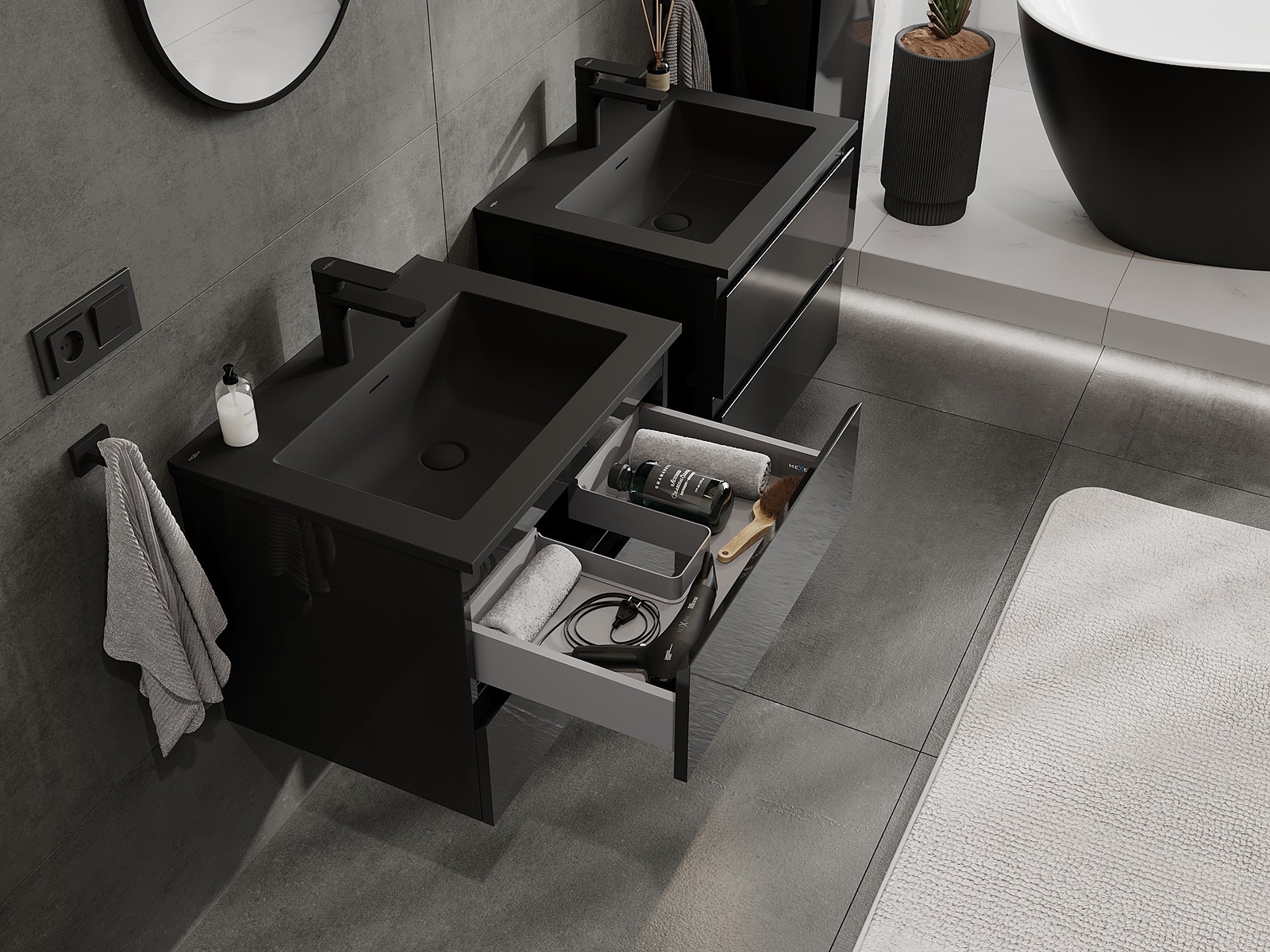 Mexen Orio Badezimmerschrank 60 cm mit Waschbecken Otis, 2 Schubladen, Schwarz glänzend/Schwarz matt