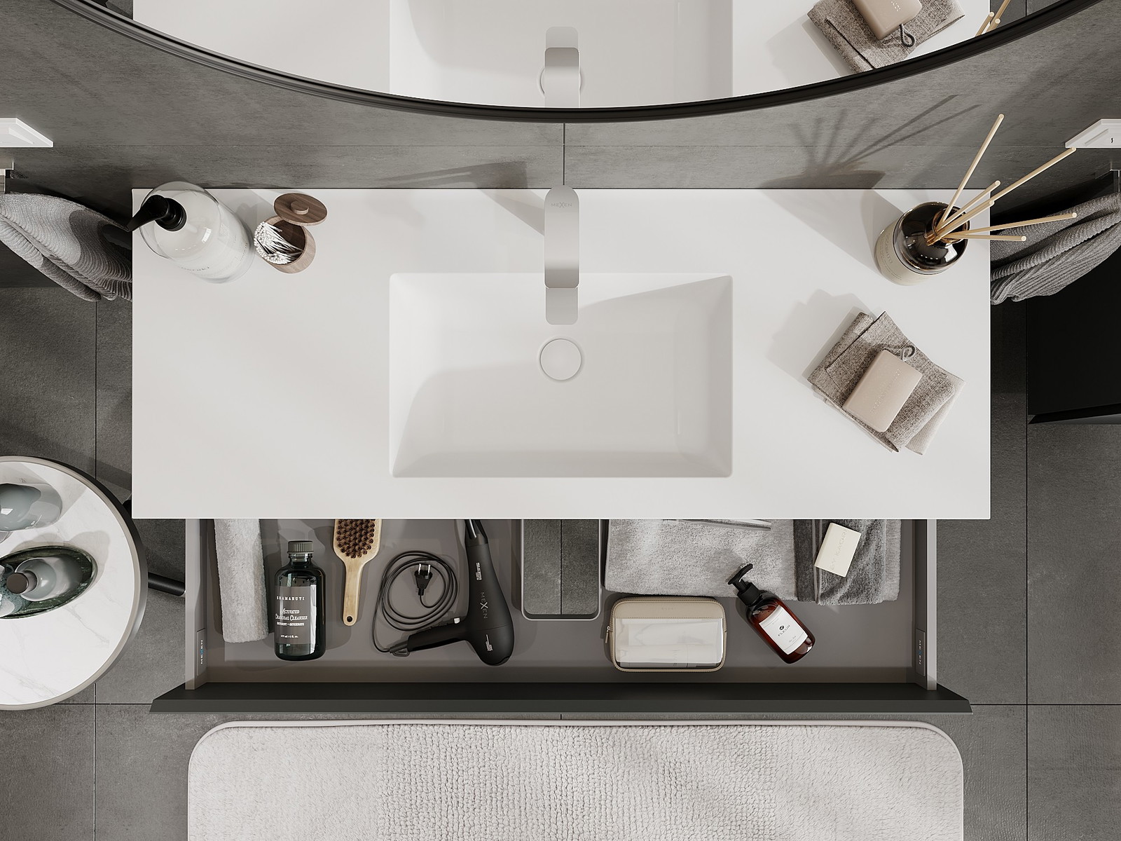 Der Ausschnitt in der Schublade ist so gestaltet, dass er den Siphon aufnehmen kann, der für Waschbeckeninstallationen erforderlich ist. Dadurch kann das Möbelstück voll funktionsfähig montiert werden, ohne auf den Platz in der Schublade zugunsten der Installation verzichten zu müssen.