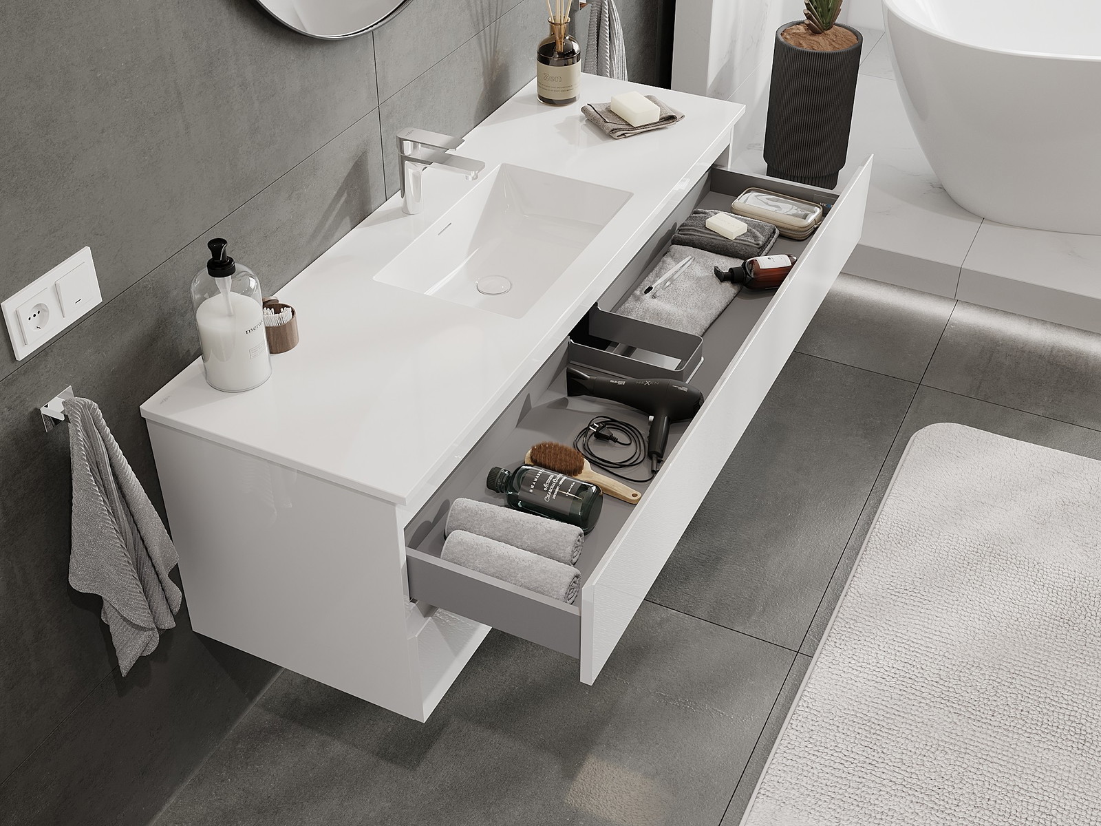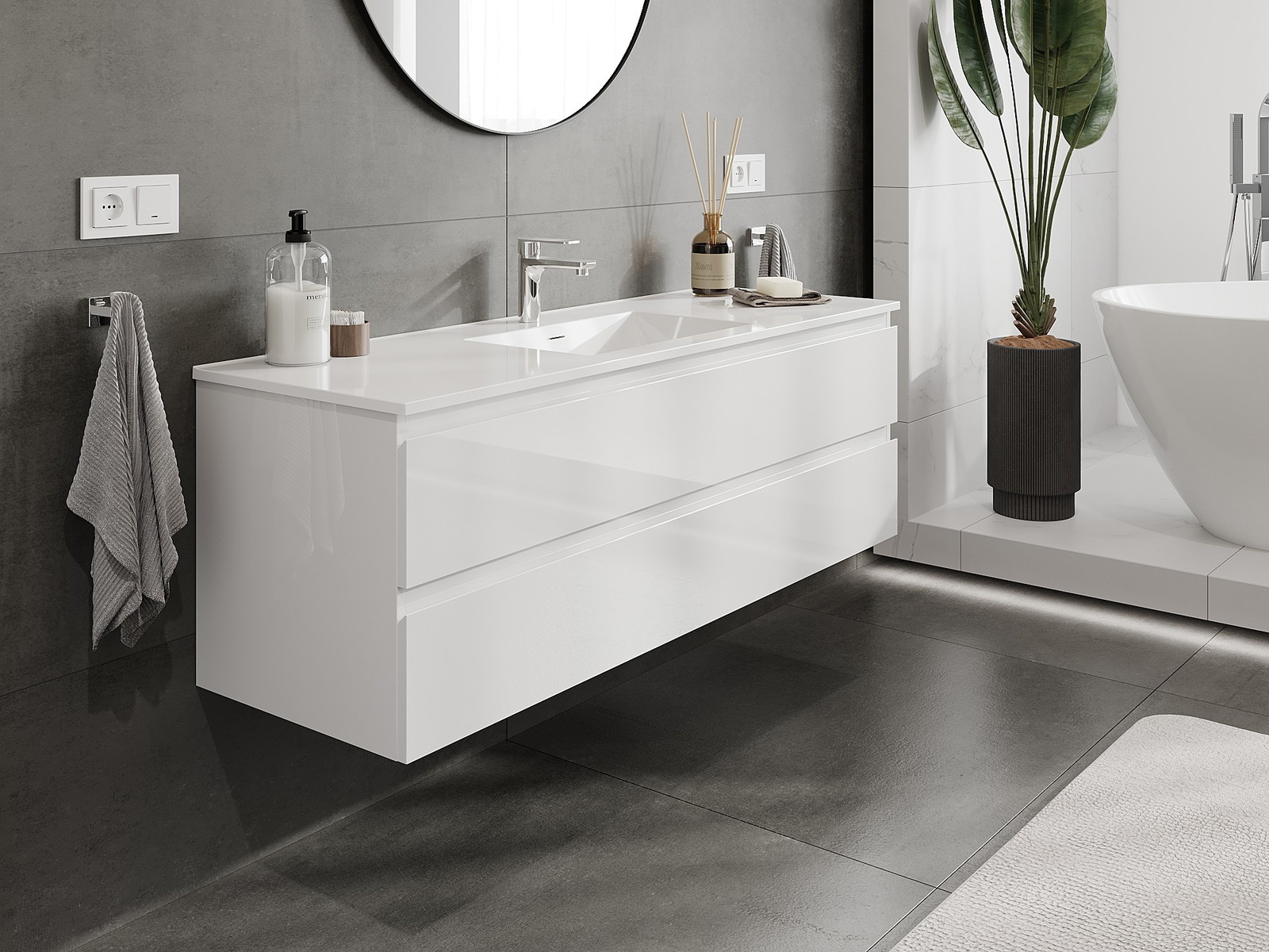 Unsere modularen Badezimmermöbel können in verschiedenen Farbkonfigurationen miteinander kombiniert werden, wodurch eine vollständige Personalisierung ermöglicht wird. Man kann sowohl das Aussehen als auch die Funktionen der einzelnen Elemente auswählen, was es erlaubt, die Möbel an eigene stilistische und funktionale Vorlieben anzupassen.