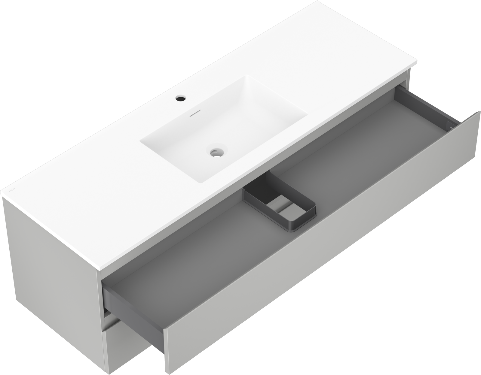 Der Ausschnitt in der Schublade ist so gestaltet, dass er den Siphon aufnehmen kann, der für Waschbeckeninstallationen erforderlich ist. Dadurch kann das Möbelstück voll funktionsfähig montiert werden, ohne auf den Platz in der Schublade zugunsten der Installation verzichten zu müssen.