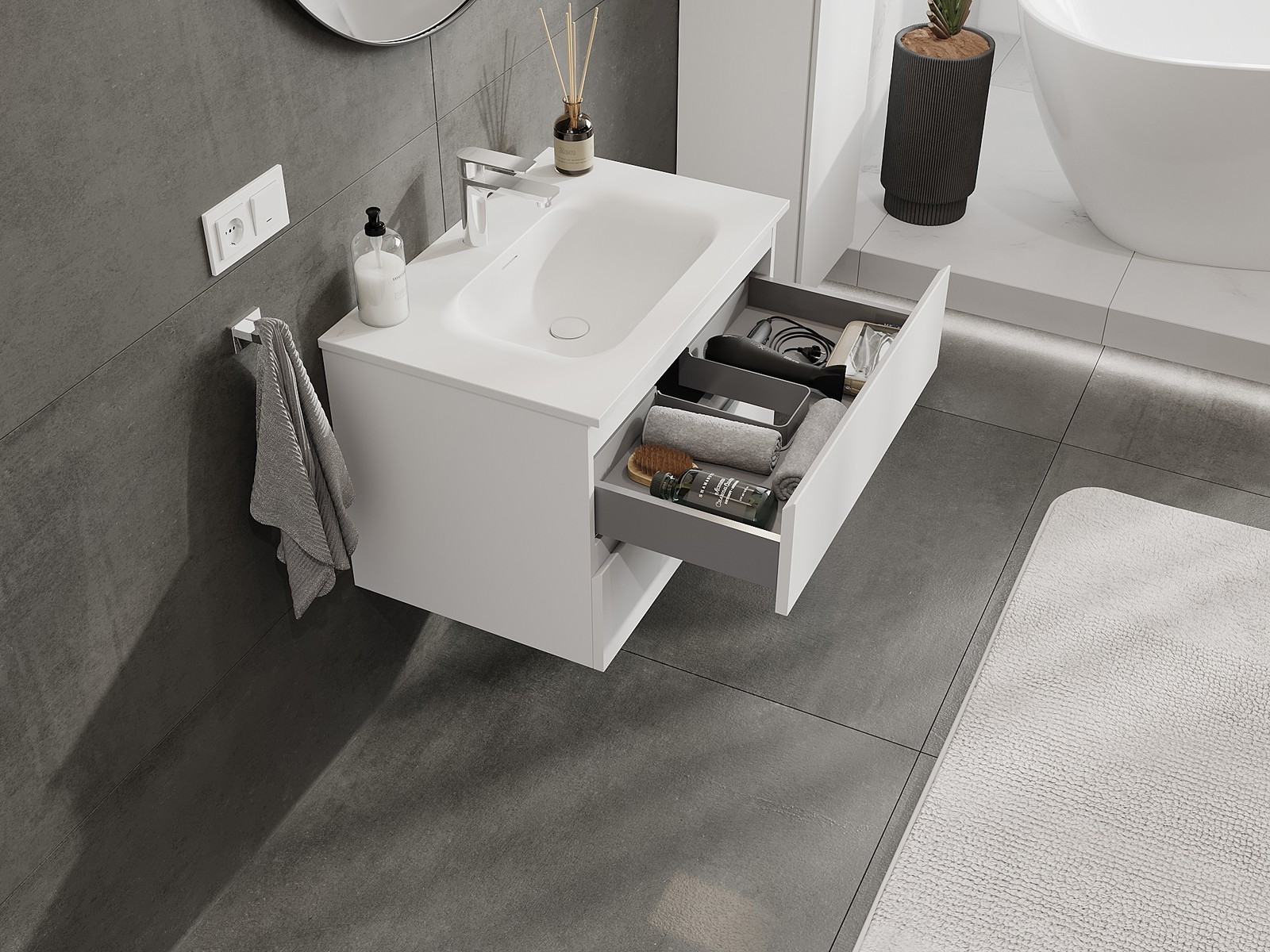 Unsere modularen Badezimmermöbel können in verschiedenen Farbkonfigurationen miteinander kombiniert werden, wodurch eine vollständige Personalisierung ermöglicht wird. Man kann sowohl das Aussehen als auch die Funktionen der einzelnen Elemente auswählen, was es erlaubt, die Möbel an eigene stilistische und funktionale Vorlieben anzupassen.
