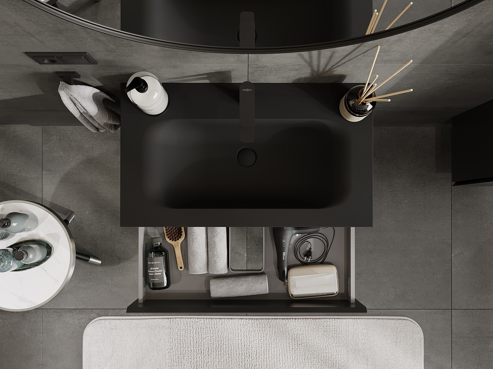Das Waschbecken verfügt über eine Öffnung, in der wir eine Armatur montieren können. Dies spart wertvollen Platz im Badezimmer und unterstreicht dessen Ästhetik. Diese Lösung ermöglicht auch eine einfachere Reinigung rund um das Waschbecken.