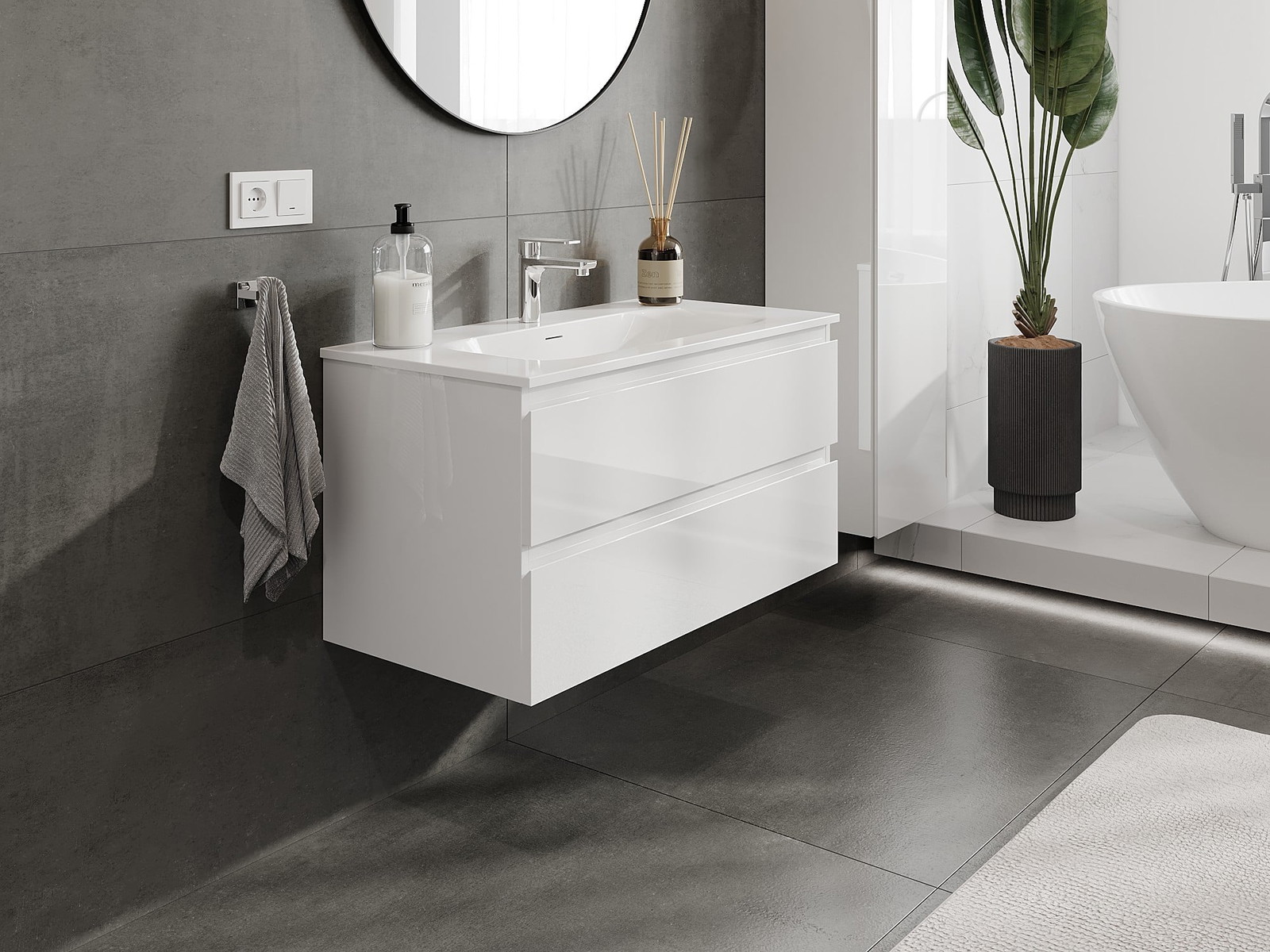 Das Waschbecken verfügt über eine Öffnung, in der wir eine Armatur montieren können. Dies spart wertvollen Platz im Badezimmer und unterstreicht dessen Ästhetik. Diese Lösung ermöglicht auch eine einfachere Reinigung rund um das Waschbecken.