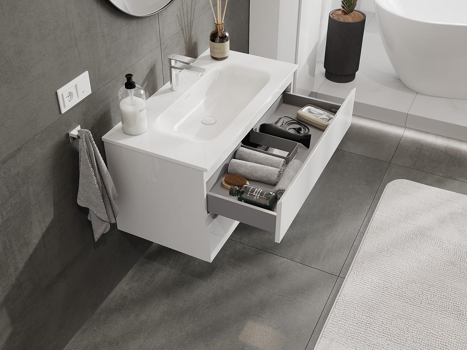 Unsere modularen Badezimmermöbel können in verschiedenen Farbkonfigurationen miteinander kombiniert werden, wodurch eine vollständige Personalisierung ermöglicht wird. Man kann sowohl das Aussehen als auch die Funktionen der einzelnen Elemente auswählen, was es erlaubt, die Möbel an eigene stilistische und funktionale Vorlieben anzupassen.
