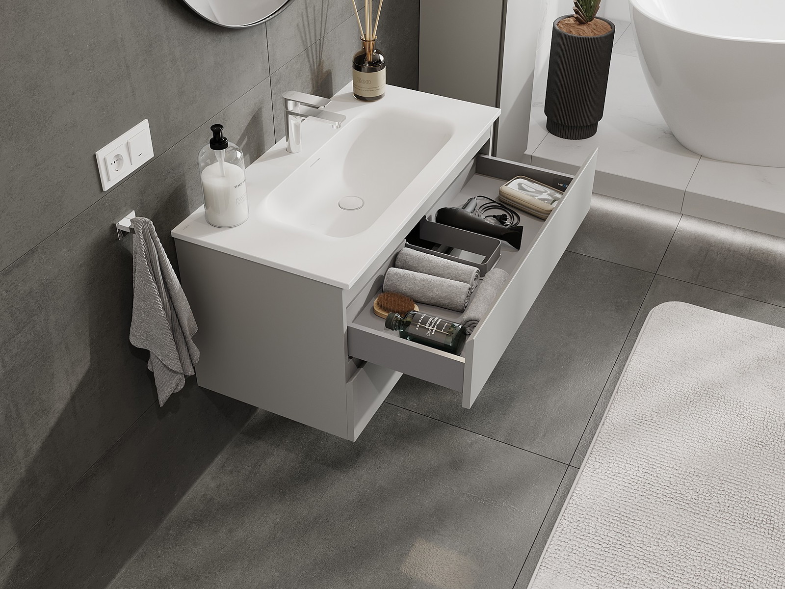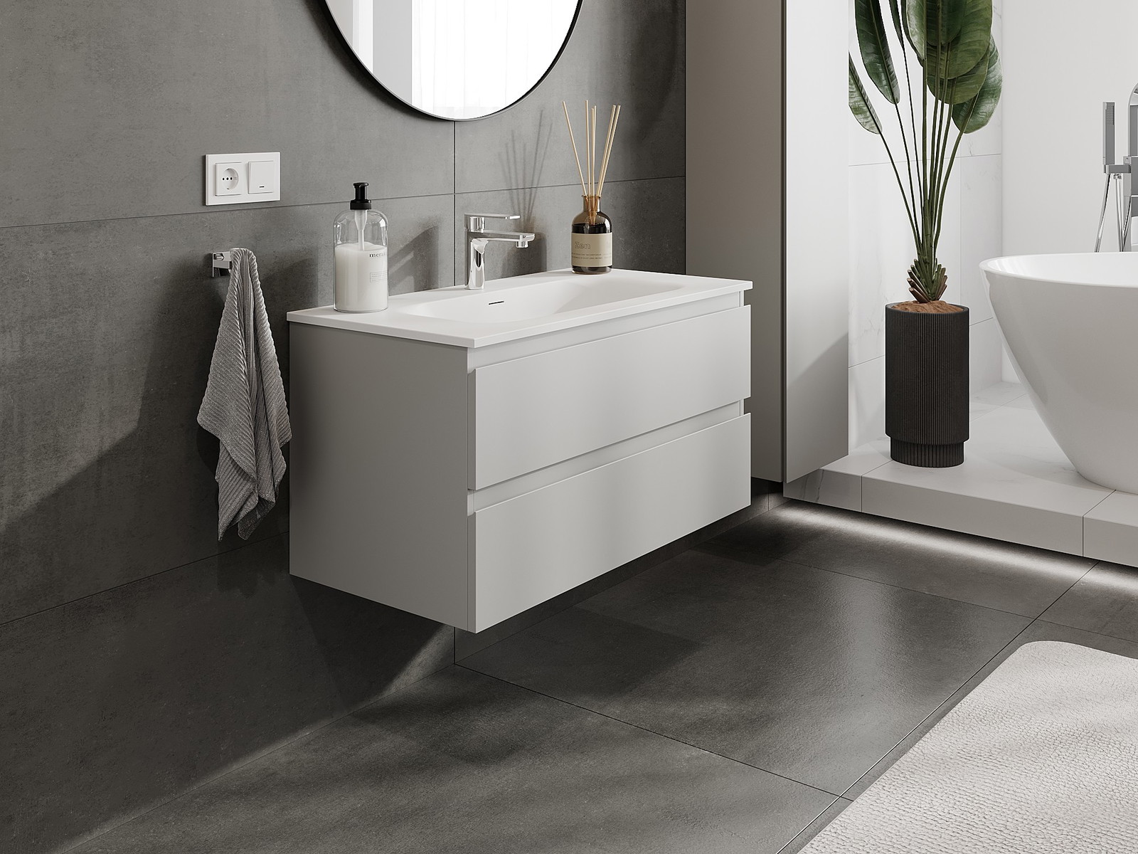 Unsere modularen Badezimmermöbel können in verschiedenen Farbkonfigurationen miteinander kombiniert werden, wodurch eine vollständige Personalisierung ermöglicht wird. Man kann sowohl das Aussehen als auch die Funktionen der einzelnen Elemente auswählen, was es erlaubt, die Möbel an eigene stilistische und funktionale Vorlieben anzupassen.