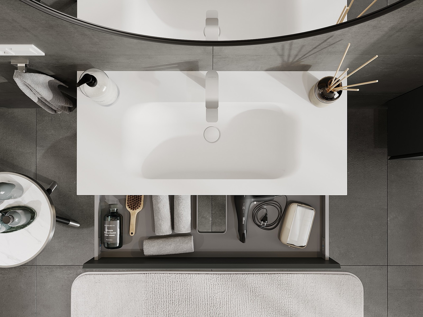 Der Ausschnitt in der Schublade ist so gestaltet, dass er den Siphon aufnehmen kann, der für Waschbeckeninstallationen erforderlich ist. Dadurch kann das Möbelstück voll funktionsfähig montiert werden, ohne auf den Platz in der Schublade zugunsten der Installation verzichten zu müssen.