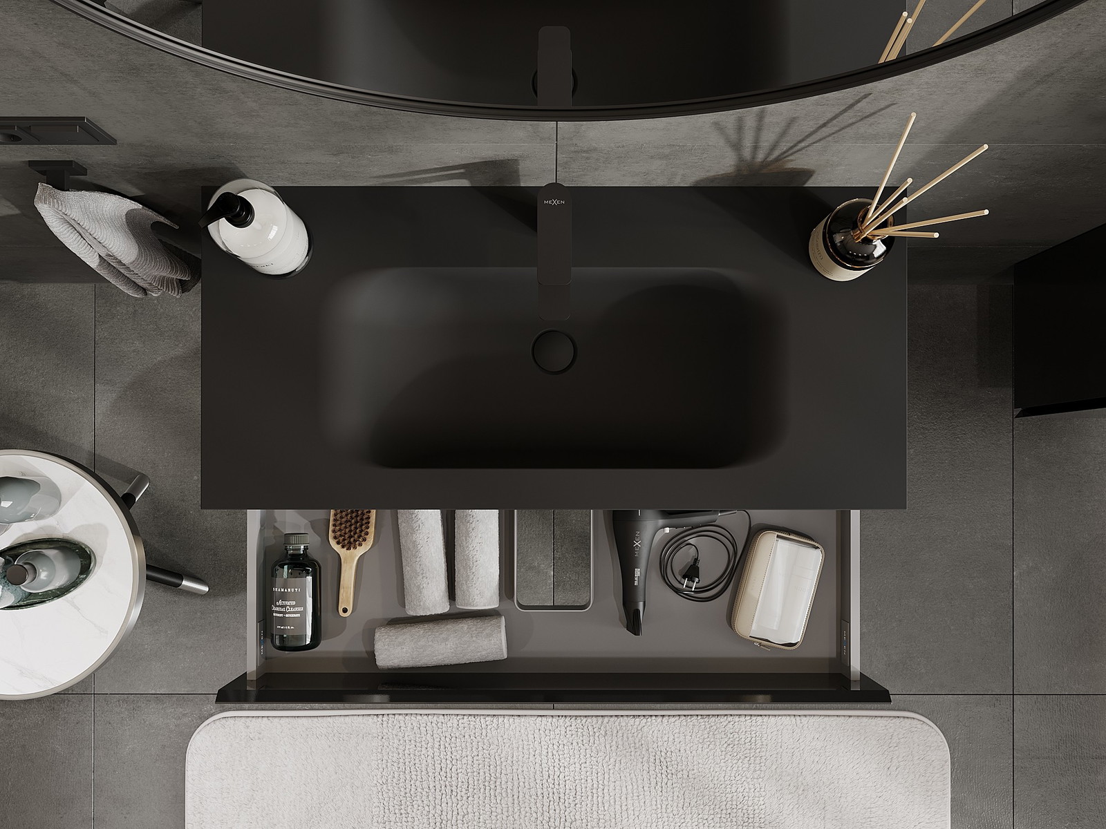 Das Waschbecken verfügt über eine Öffnung, in der wir eine Armatur montieren können. Dies spart wertvollen Platz im Badezimmer und unterstreicht dessen Ästhetik. Diese Lösung ermöglicht auch eine einfachere Reinigung rund um das Waschbecken.