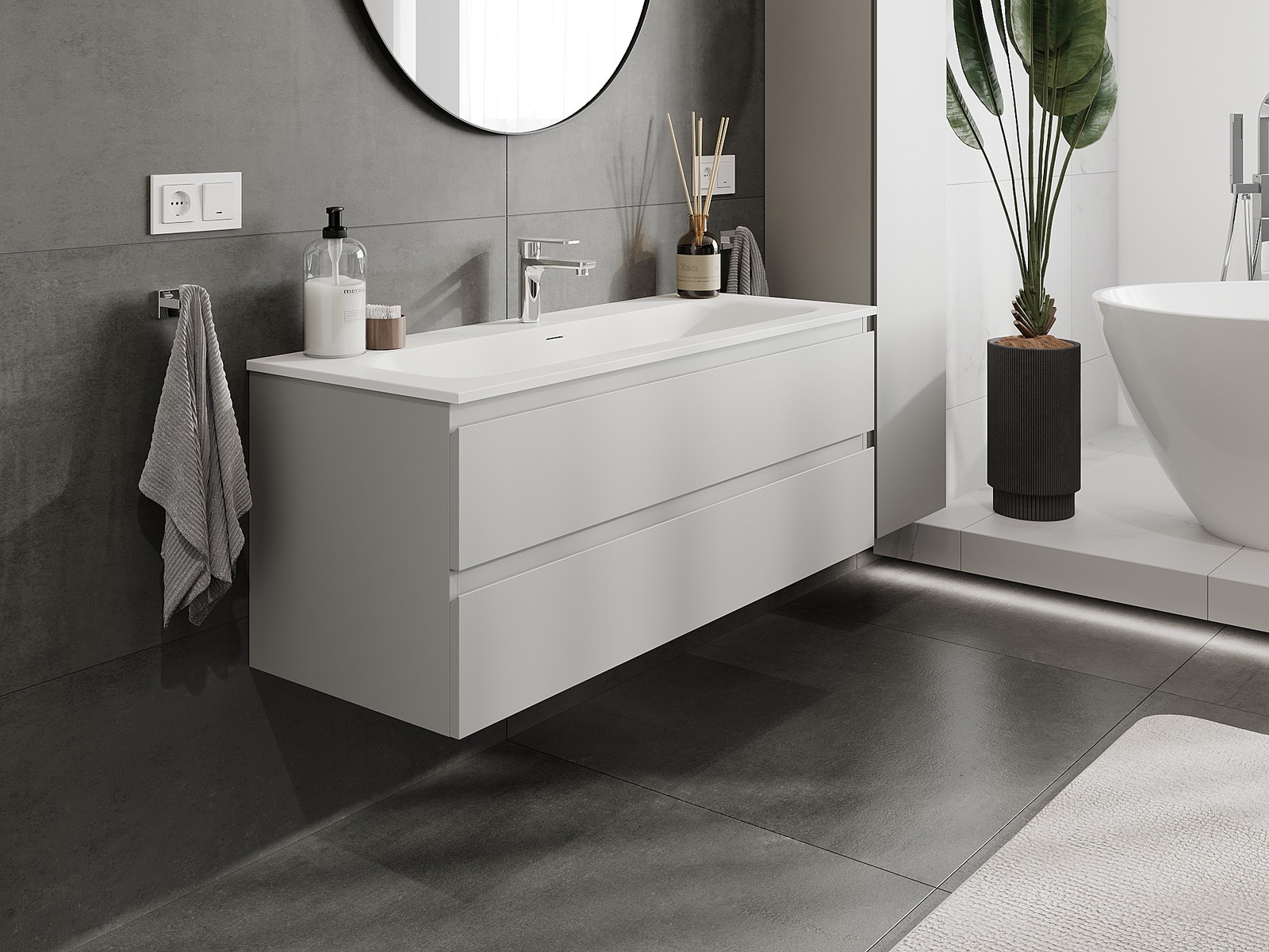 Unsere modularen Badezimmermöbel können in verschiedenen Farbkonfigurationen miteinander kombiniert werden, wodurch eine vollständige Personalisierung ermöglicht wird. Man kann sowohl das Aussehen als auch die Funktionen der einzelnen Elemente auswählen, was es erlaubt, die Möbel an eigene stilistische und funktionale Vorlieben anzupassen.