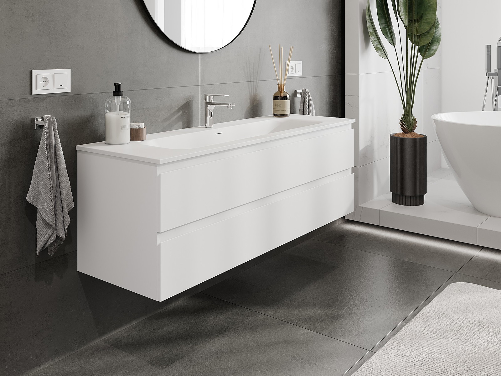 Das Waschbecken verfügt über eine Öffnung, in der wir eine Armatur montieren können. Dies spart wertvollen Platz im Badezimmer und unterstreicht dessen Ästhetik. Diese Lösung ermöglicht auch eine einfachere Reinigung rund um das Waschbecken.
