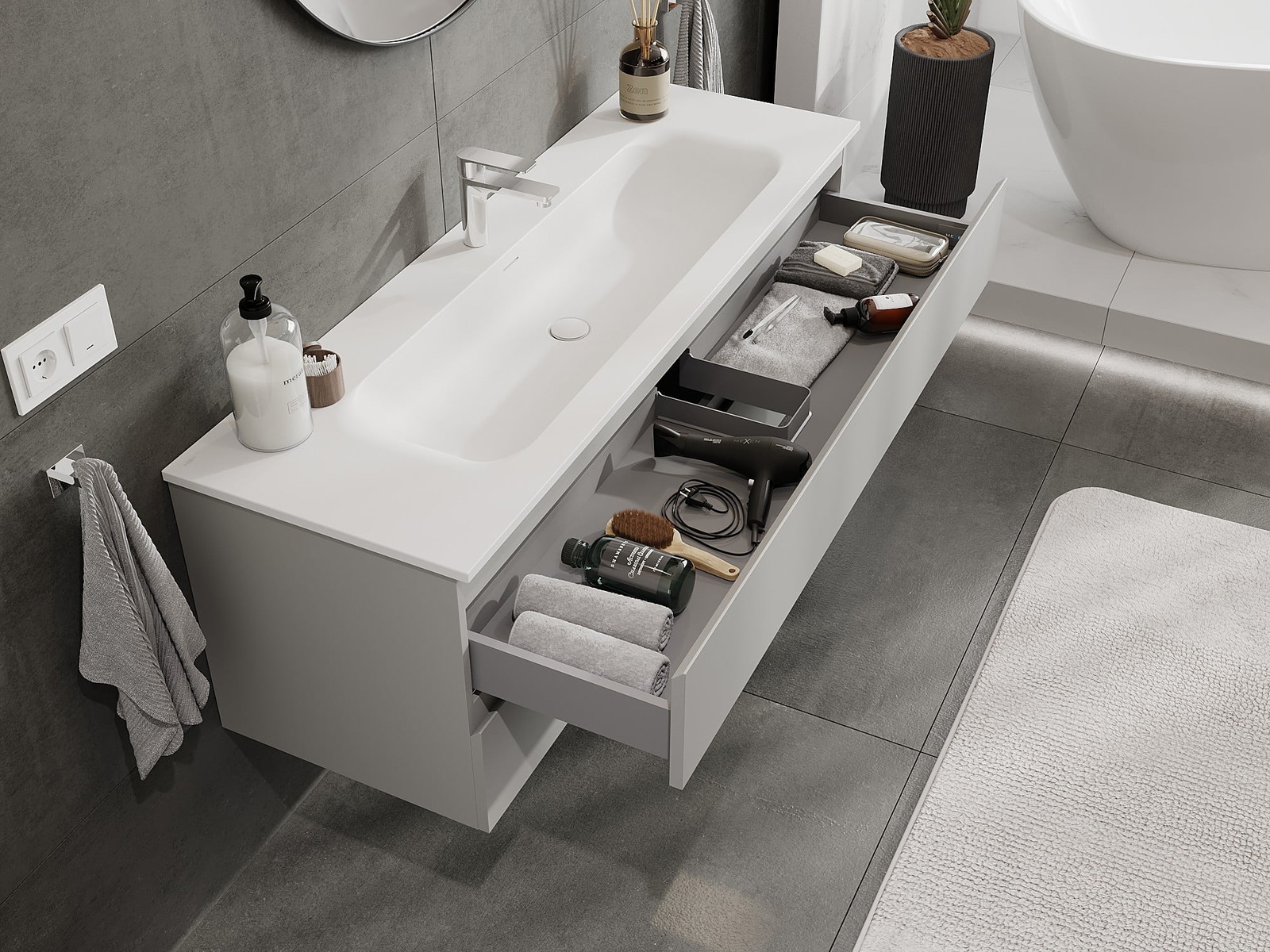 Unsere modularen Badezimmermöbel können in verschiedenen Farbkonfigurationen miteinander kombiniert werden, wodurch eine vollständige Personalisierung ermöglicht wird. Man kann sowohl das Aussehen als auch die Funktionen der einzelnen Elemente auswählen, was es erlaubt, die Möbel an eigene stilistische und funktionale Vorlieben anzupassen.