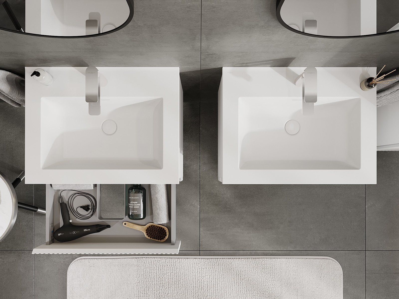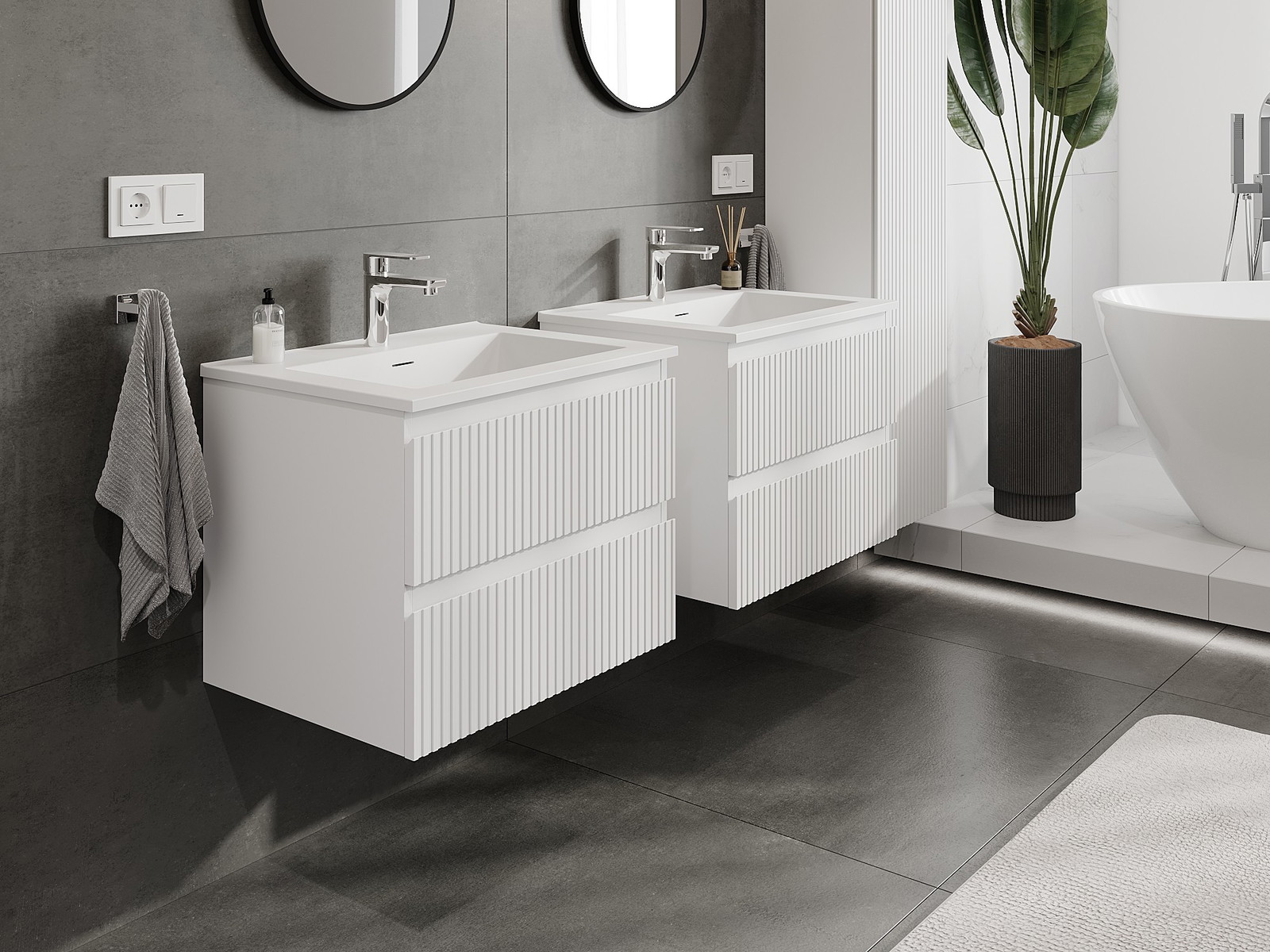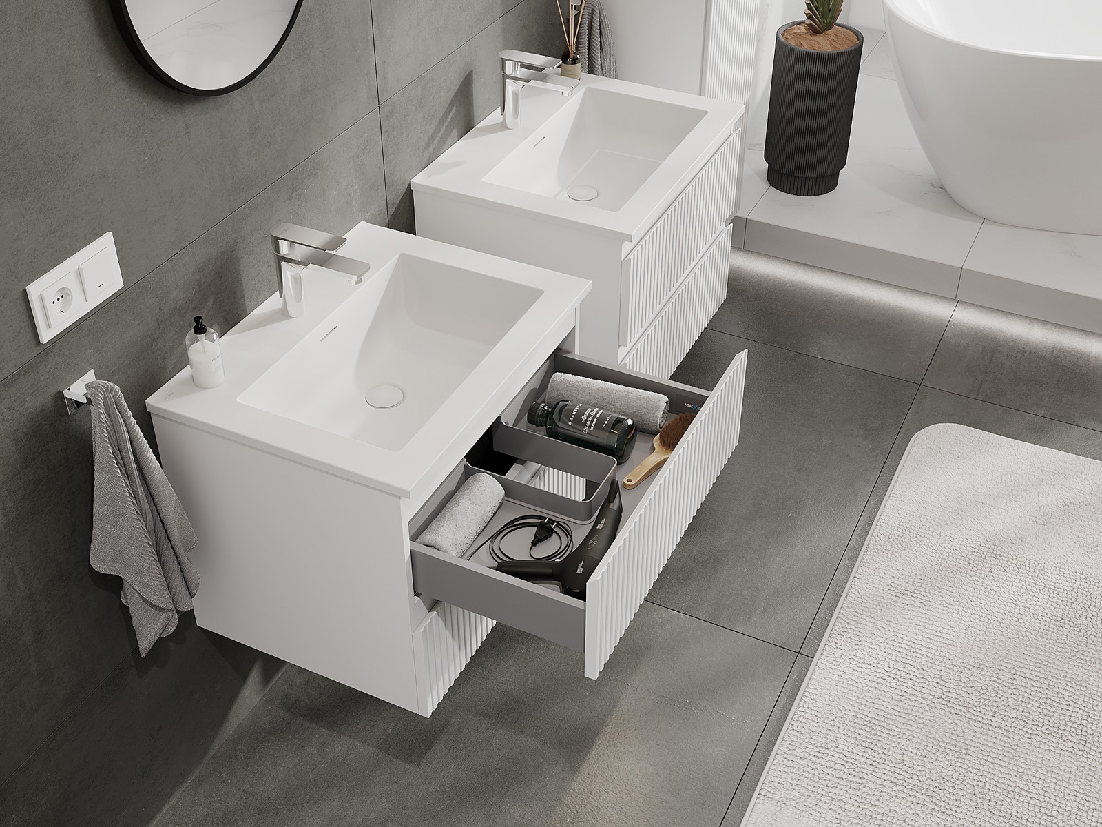 Mexen Rivel Badezimmerschrank 60 cm mit Waschbecken Otis, 2 Schubladen, gerillt, weiß matt - 91A20-06047-2-BFF01-W18M01