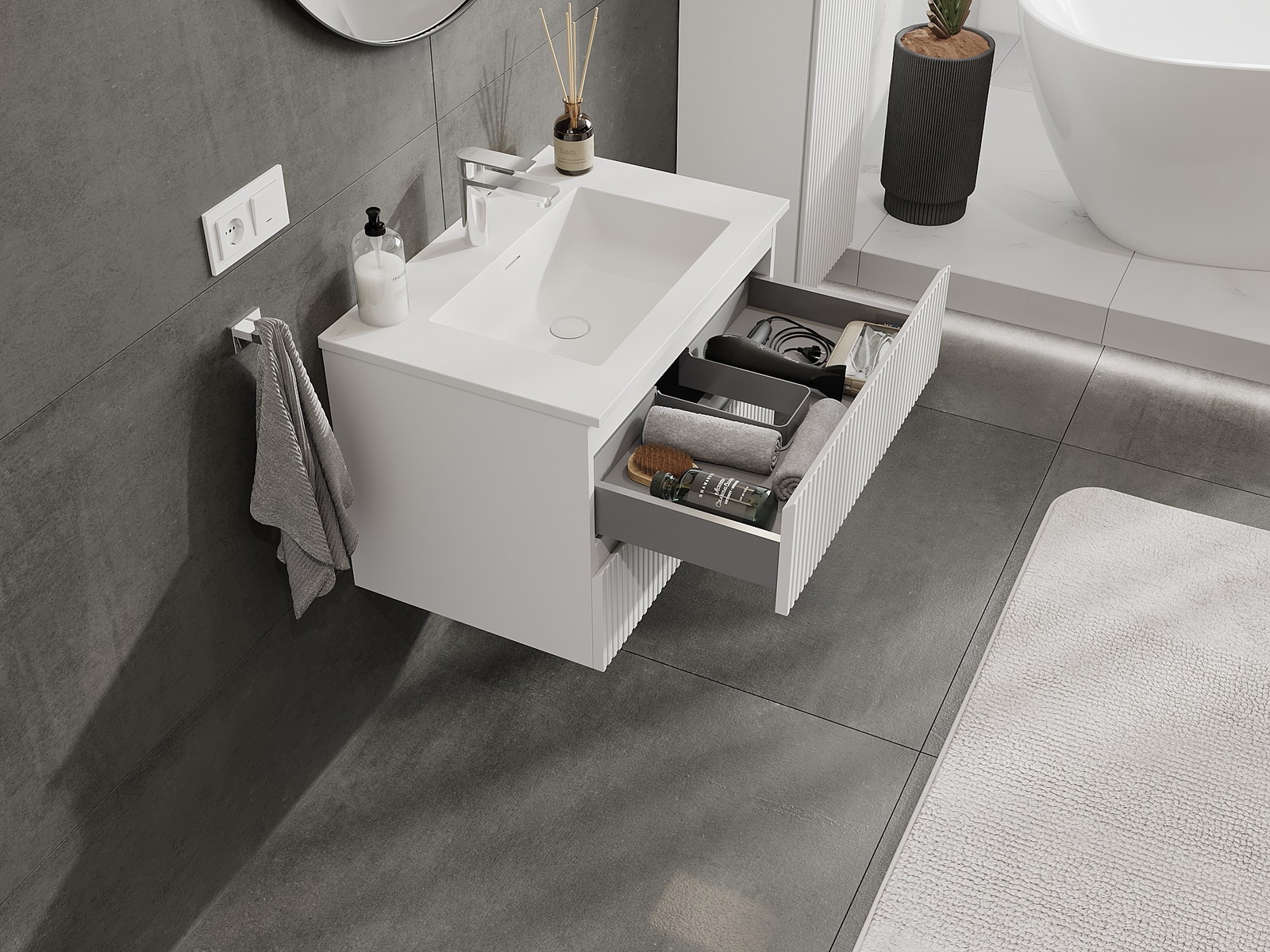 Mexen Rivel Badezimmerschrank 70 cm mit Waschbecken Otis, 2 Schubladen, gerillt, weiß matt - 91A20-07047-2-BFF01-W18M01