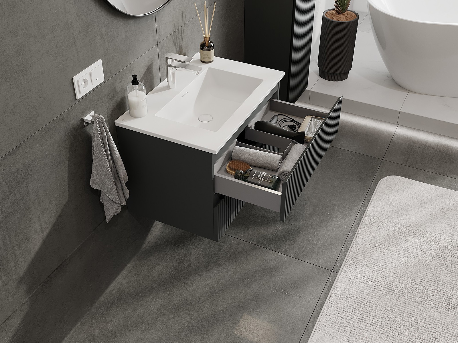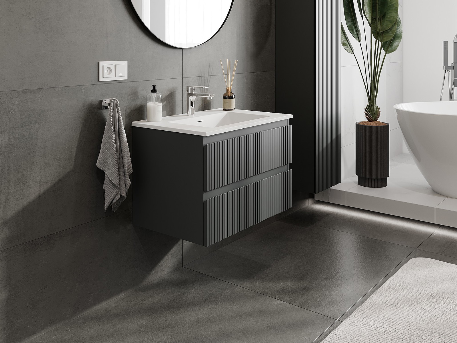 Mexen Rivel Badezimmerschrank 70 cm mit Waschbecken Otis, 2 Schubladen, geriffelt, Graphit matt/Weiß matt -