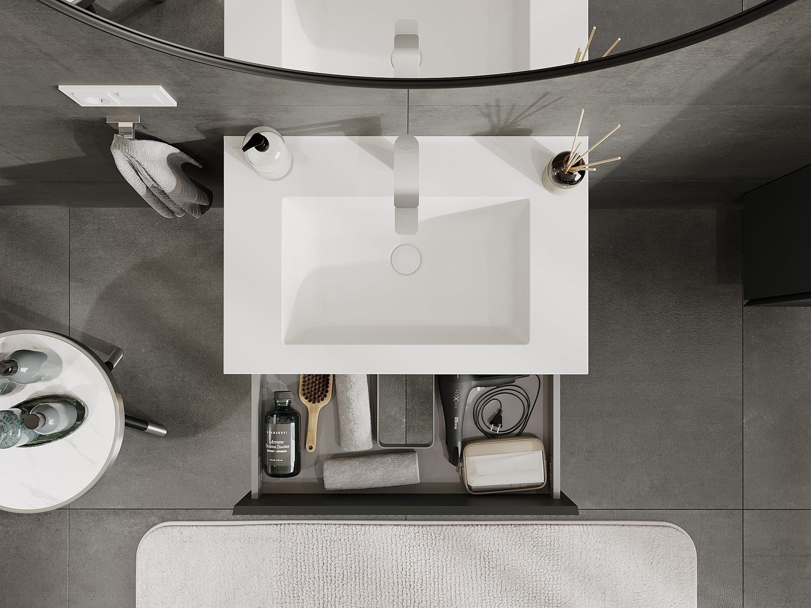 Der Ausschnitt in der Schublade ist so gestaltet, dass er den Siphon aufnehmen kann, der für Waschbeckeninstallationen erforderlich ist. Dadurch kann das Möbelstück voll funktionsfähig montiert werden, ohne auf den Platz in der Schublade zugunsten der Installation verzichten zu müssen.