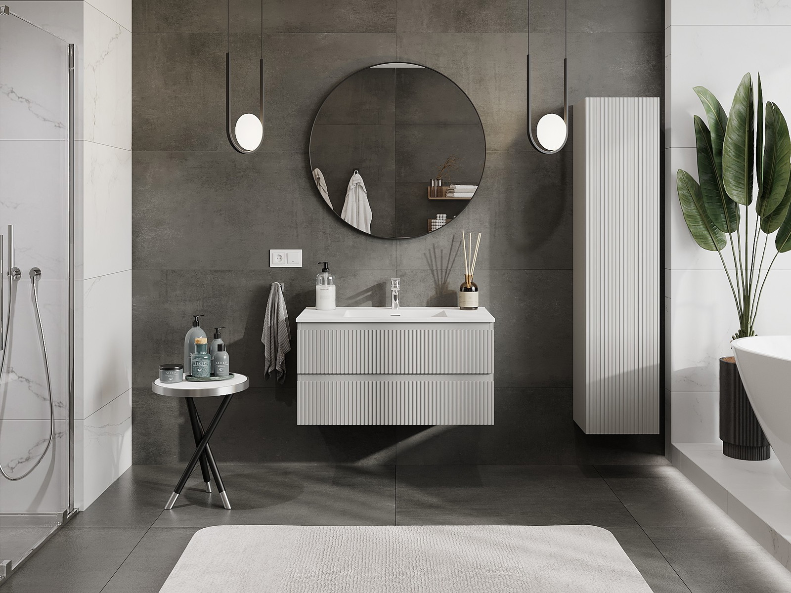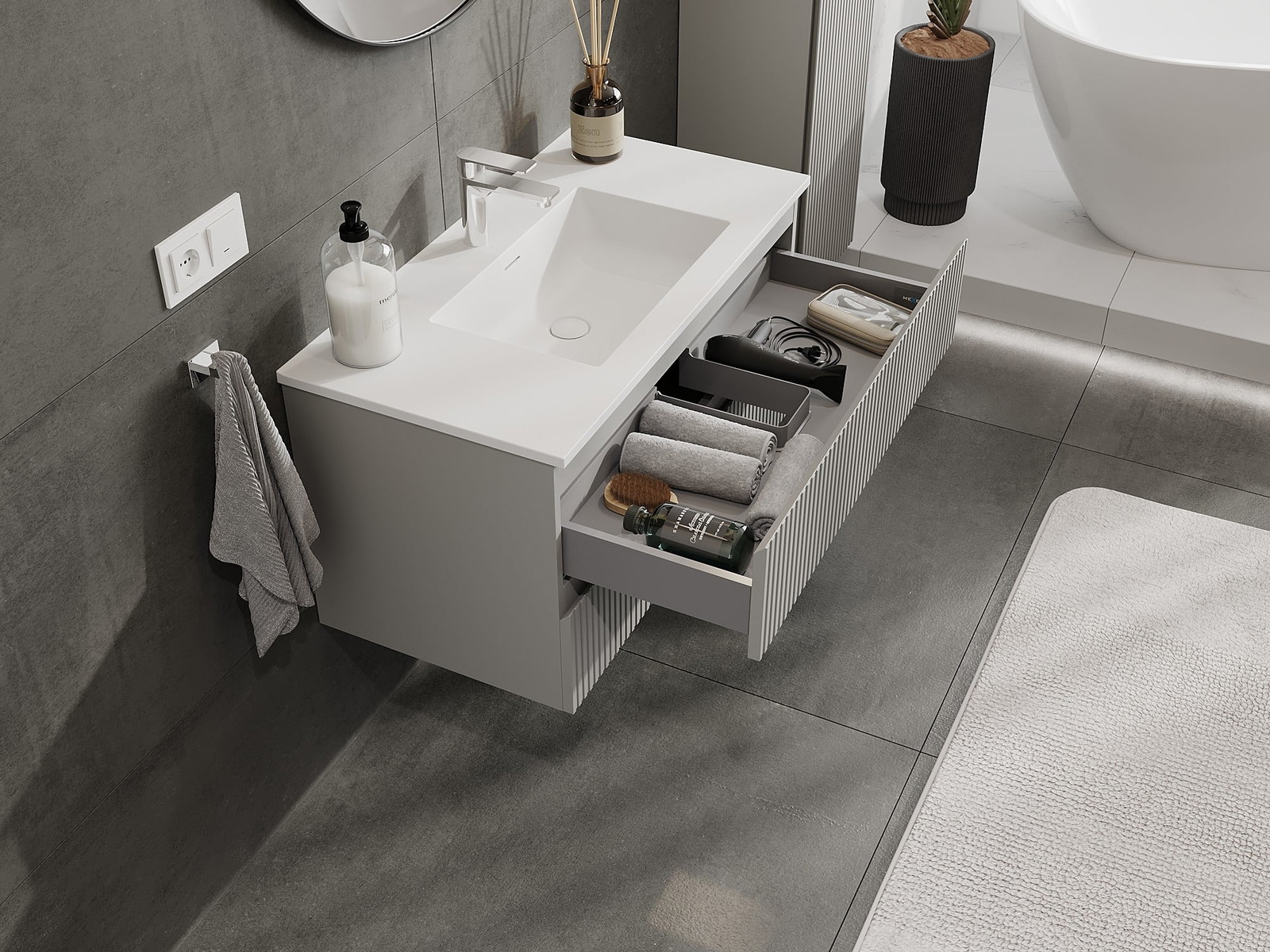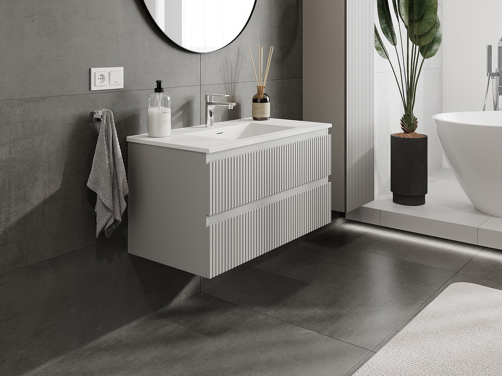 Mexen Rivel Badezimmerschrank 90 cm mit Waschbecken Otis, 2 Schubladen, gerillt, grau matt/weiß matt