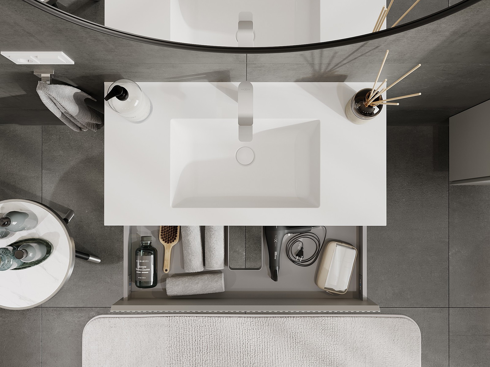 Der Ausschnitt in der Schublade ist so gestaltet, dass er den Siphon aufnehmen kann, der für Waschbeckeninstallationen erforderlich ist. Dadurch kann das Möbelstück voll funktionsfähig montiert werden, ohne auf den Platz in der Schublade zugunsten der Installation verzichten zu müssen.