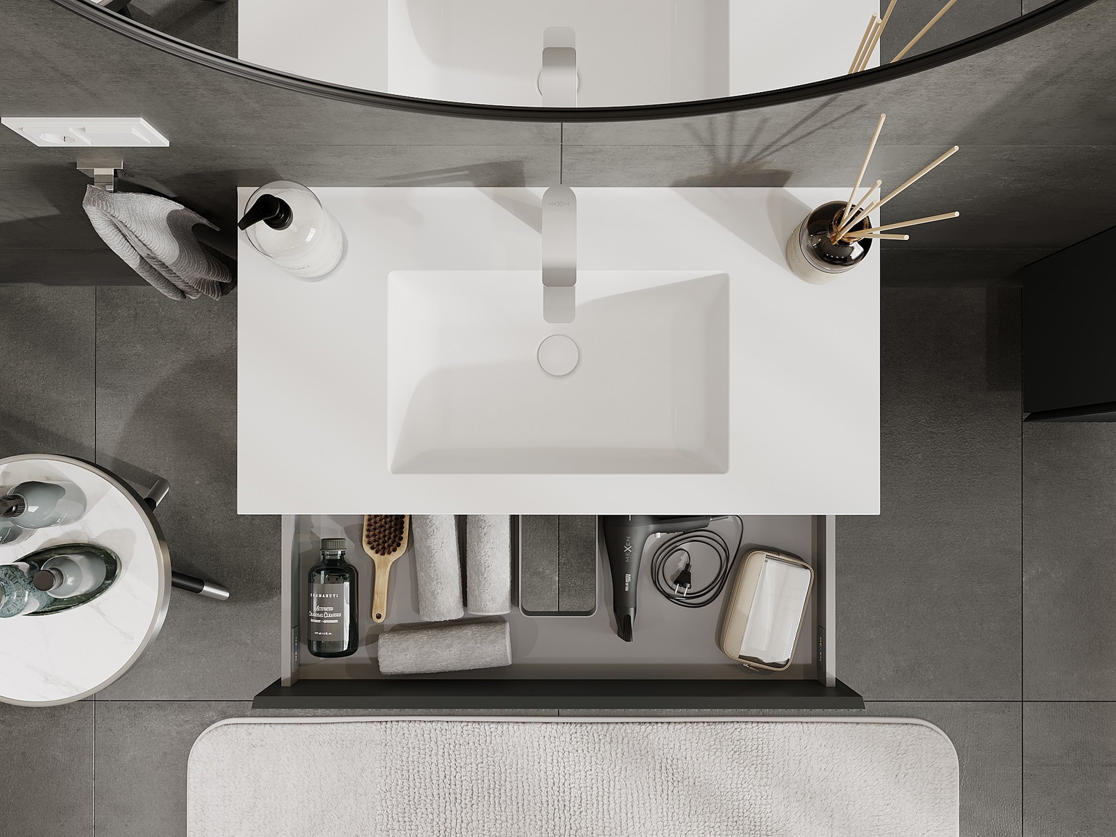 Der Ausschnitt in der Schublade ist so gestaltet, dass er den Siphon aufnehmen kann, der für Waschbeckeninstallationen erforderlich ist. Dadurch kann das Möbelstück voll funktionsfähig montiert werden, ohne auf den Platz in der Schublade zugunsten der Installation verzichten zu müssen.