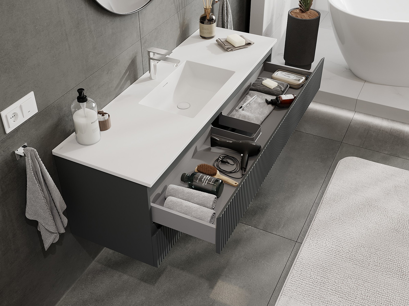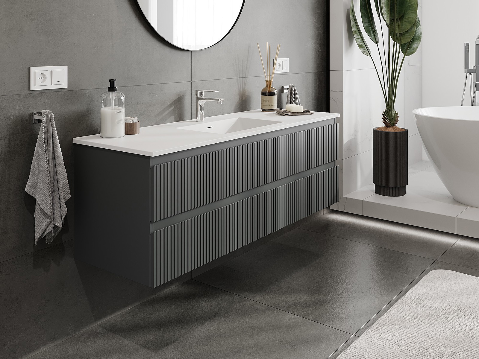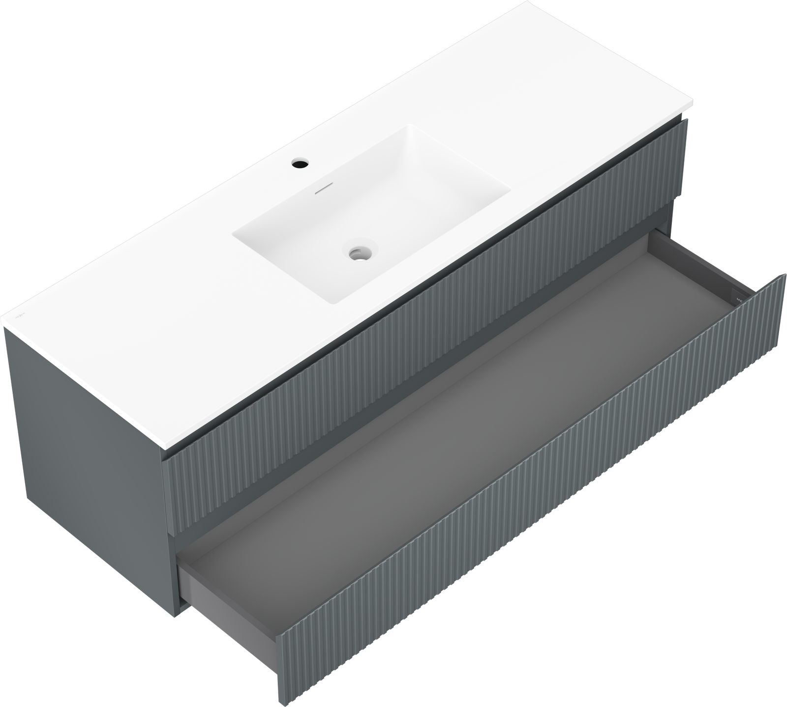 Mexen Rivel Badezimmerschrank 140 cm mit Waschbecken Otis, 2 Schubladen, geriffelt, graphit matt/weiß matt -