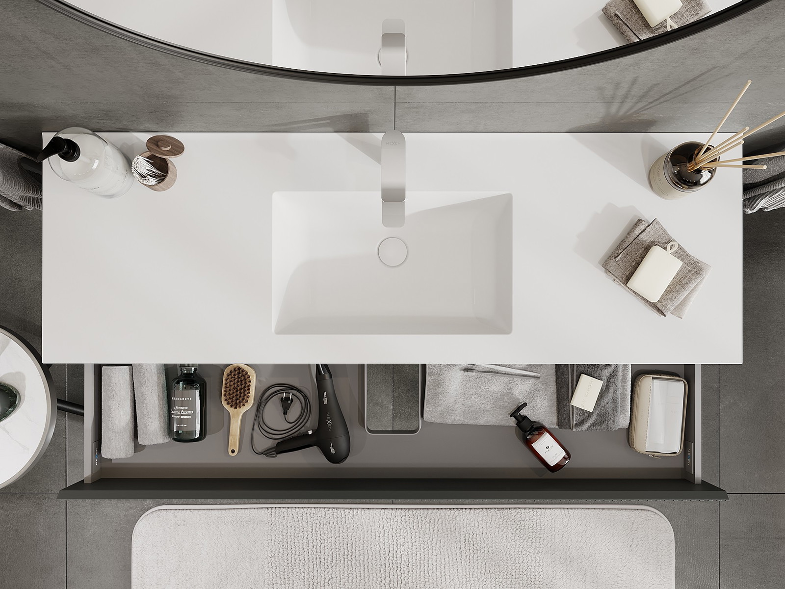 Der Ausschnitt in der Schublade ist so gestaltet, dass er den Siphon aufnehmen kann, der für Waschbeckeninstallationen erforderlich ist. Dadurch kann das Möbelstück voll funktionsfähig montiert werden, ohne auf den Platz in der Schublade zugunsten der Installation verzichten zu müssen.