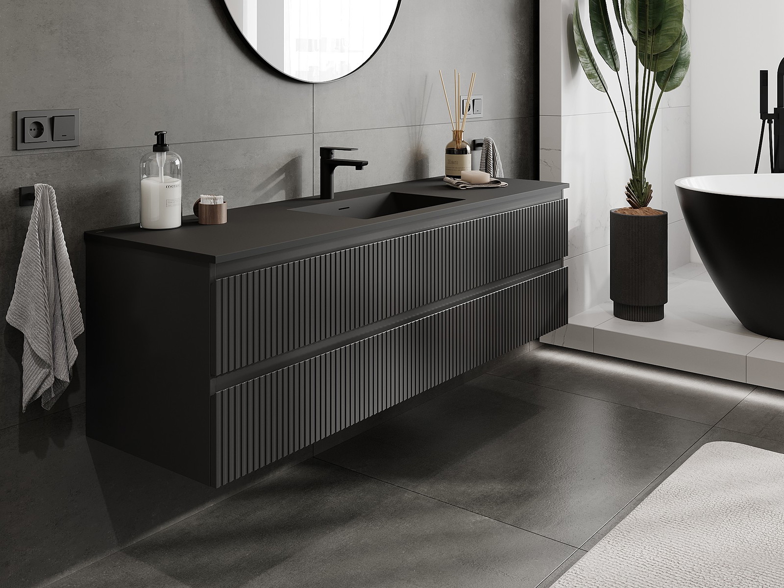 Mexen Rivel Badezimmerschrank 160 cm mit Waschbecken Otis, 2 Schubladen, gerillt, schwarz matt - 91A20-16047-2-BFF71-W18M71