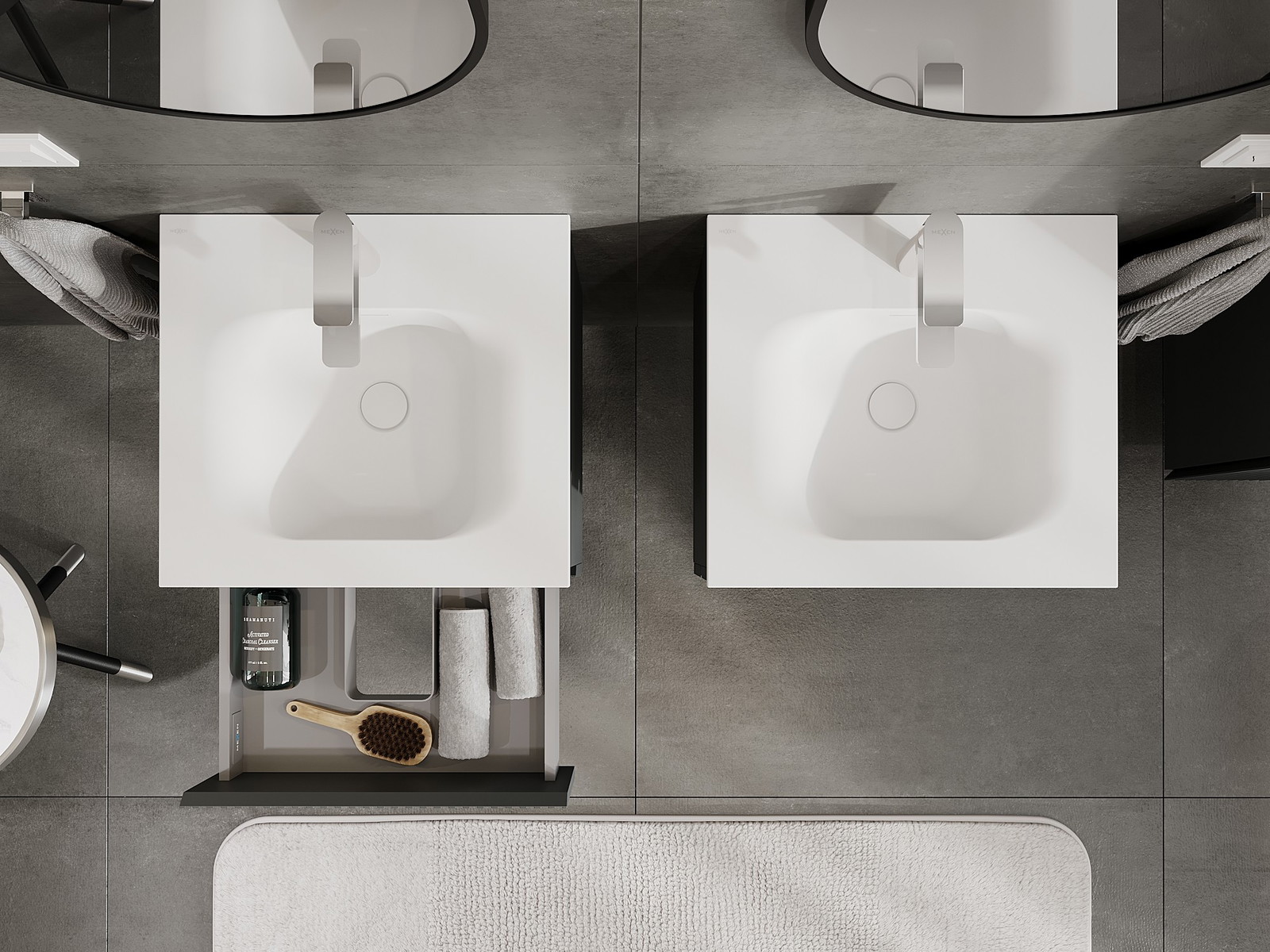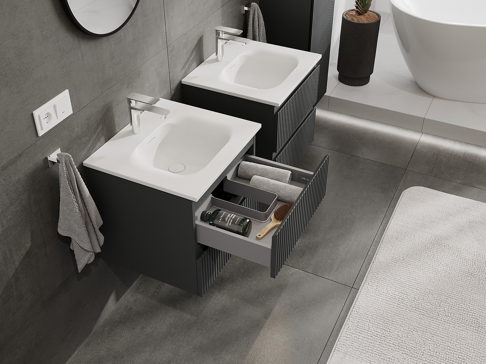 Unsere modularen Badezimmermöbel können in verschiedenen Farbkonfigurationen miteinander kombiniert werden, wodurch eine vollständige Personalisierung ermöglicht wird. Man kann sowohl das Aussehen als auch die Funktionen der einzelnen Elemente auswählen, was es erlaubt, die Möbel an eigene stilistische und funktionale Vorlieben anzupassen.
