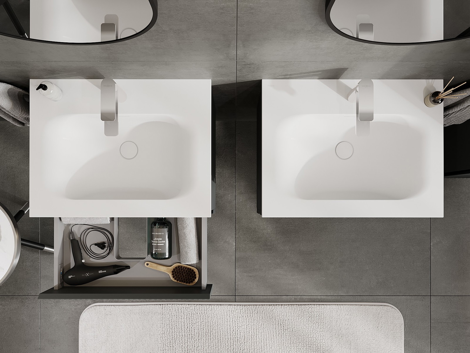 Unsere modularen Badezimmermöbel können in verschiedenen Farbkonfigurationen miteinander kombiniert werden, wodurch eine vollständige Personalisierung ermöglicht wird. Man kann sowohl das Aussehen als auch die Funktionen der einzelnen Elemente auswählen, was es erlaubt, die Möbel an eigene stilistische und funktionale Vorlieben anzupassen.