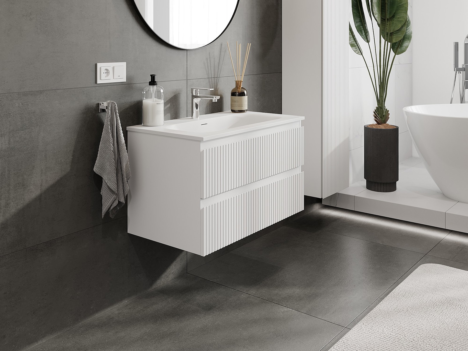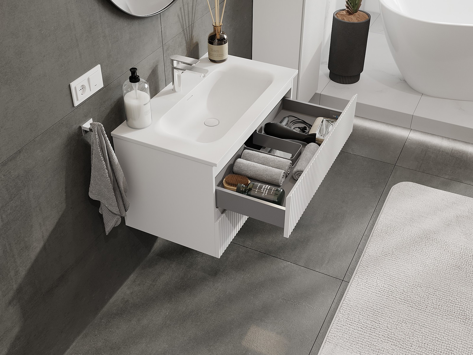 Unsere modularen Badezimmermöbel können in verschiedenen Farbkonfigurationen miteinander kombiniert werden, wodurch eine vollständige Personalisierung ermöglicht wird. Man kann sowohl das Aussehen als auch die Funktionen der einzelnen Elemente auswählen, was es erlaubt, die Möbel an eigene stilistische und funktionale Vorlieben anzupassen.